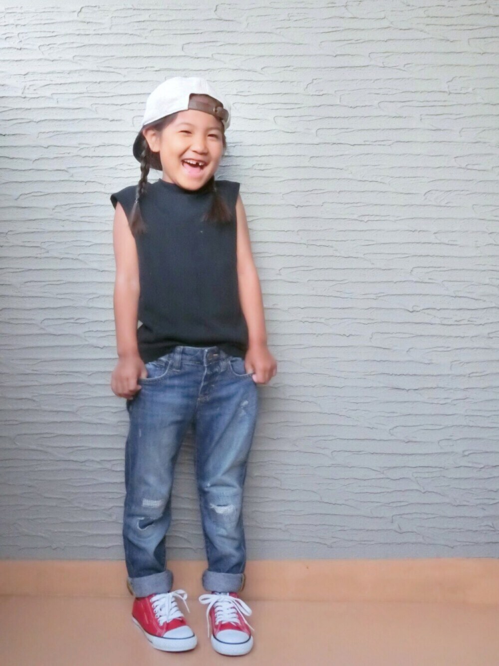 最後はやっぱりデニムで♡♡ ドラフトコーデ、お付き合いありがとうございました👧🏻💕 ムスメもこれは嫌とか、これはいい‼︎とか一緒にコーデ考えてくれました♡ そんなムスメ、かれこれ4月くらいから、ずーっとぐらぐらしてた前歯がやっと抜けて歯抜けちゃん♡♡ 歯が抜けても大笑いするところがイイネ‼︎😂💕