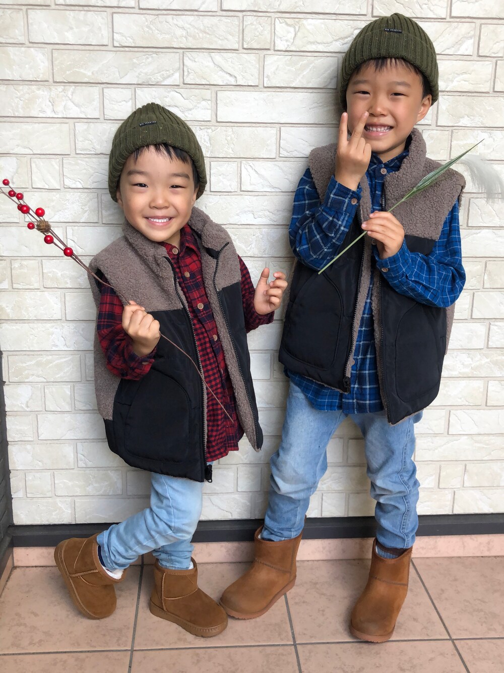 やま家のダウンベスト「リバーシブル 中綿ベスト」を使ったコーディネート