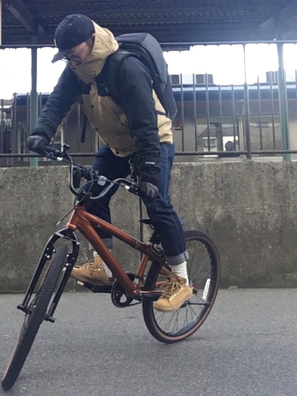 おはようございます。 こんにちは。こんばんは。 大人の遊びと題し…長男の自転車にて久しぶりにBMX風に遊んでみました。 今回は完全に通勤時の防寒着になってます。 デニム×スウェット×アウター 手袋×バックパック×キャップ 基本動きやすいのが前提笑 ※個人的には背負ってるバックパックがお気に入りです。だいぶ好みが分かれますが…ね。 ただ今娘ちゃんが胃腸炎により入院中のため、ママがいなくて寂しがってる長男を甘やかせ過ぎず楽しませることを考えてる私です。 いつもイイネやお気に入りまでありがとうございます。 最近では人見知りの中でコメントまでさせていただけるようになり感謝ばかりです。 失礼いたしました。