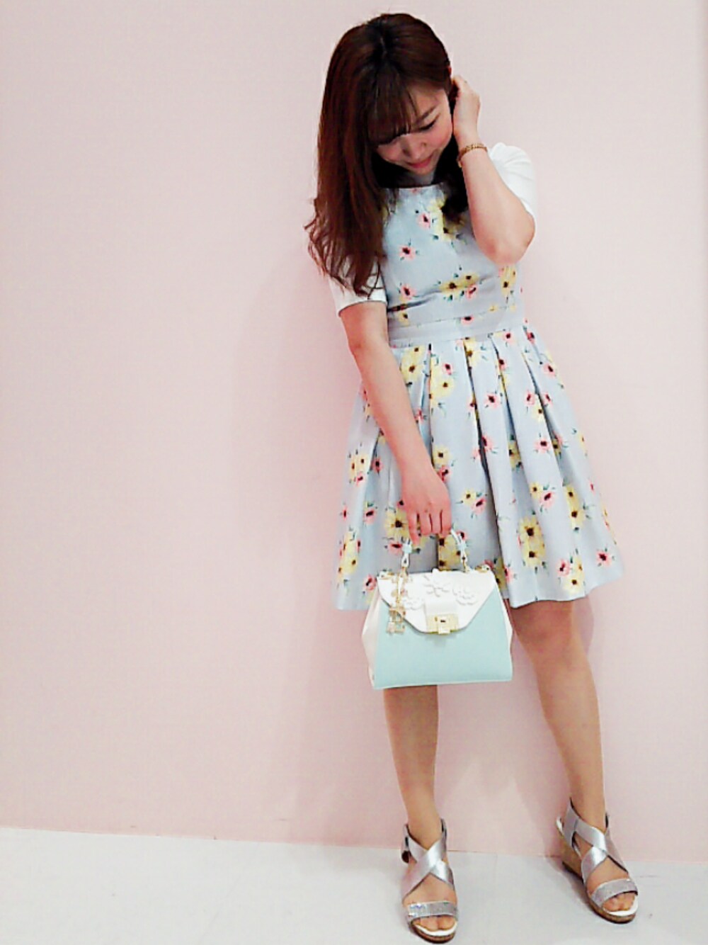 こんばんは🌙😃❗ いつもありがとうございます(^^)❤ いいね!閲覧、お気に入り頂けて嬉しいです☺❤ ブルーのワンピース、グリーンのバック👜 寒色系に、デイジー柄のピンクとイエローを差し色にしたガーリーコーデ🌼 バックにもさりげなくお花がついてます☺