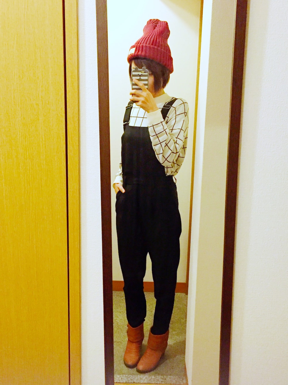 うちに増殖中のニット帽をかぶって、ちょっとそこまで。 GUのサロペットは安カワで使えます!