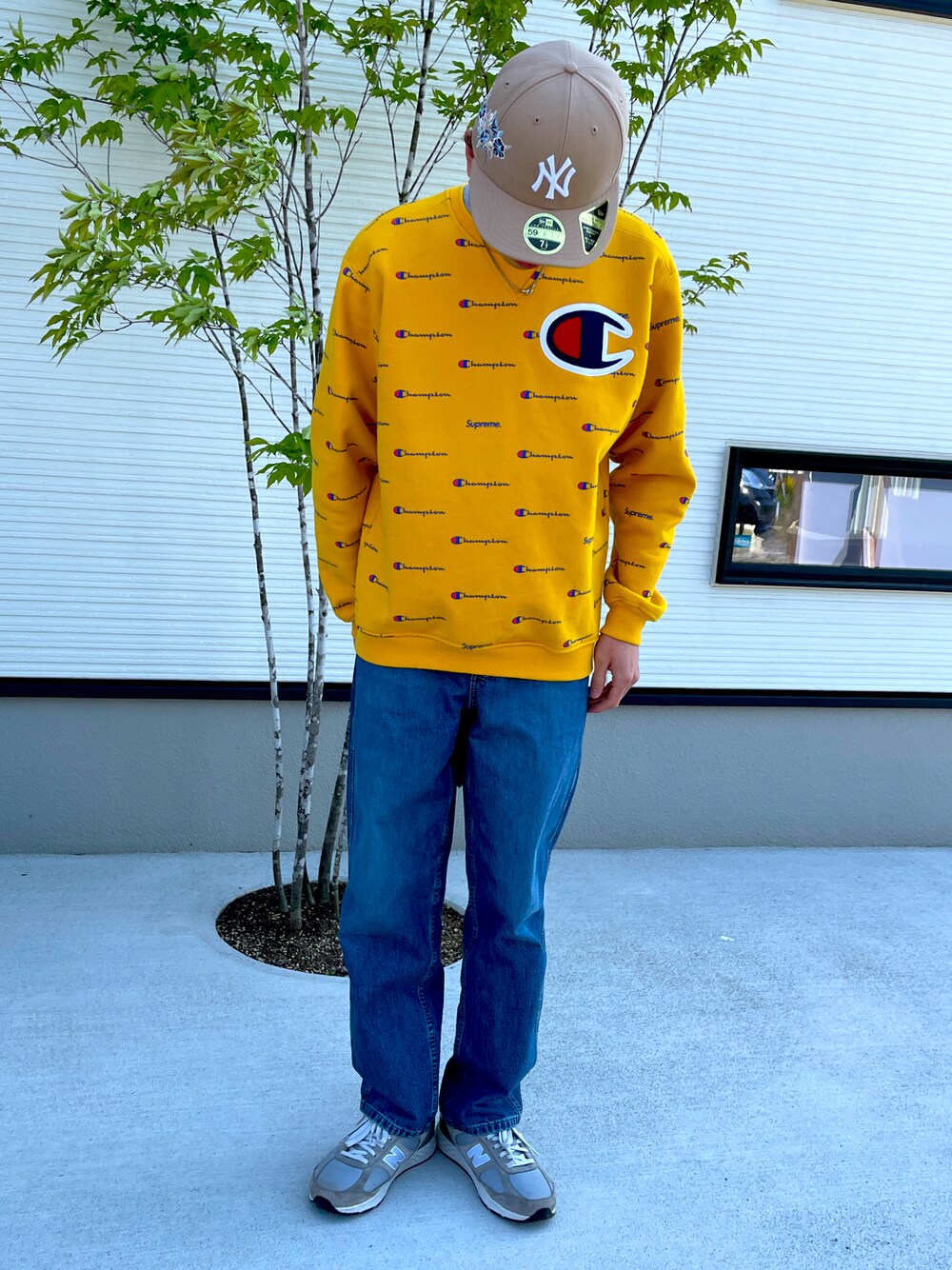 supreme✖️championのコラボスウェットは 肉厚で暖かい🥵 黄色もインパクト大でロゴもたくさん散りばめられてて可愛い! UNIQLOのジーンズ久々に買ったけどシルエットかわいすぎ!!
