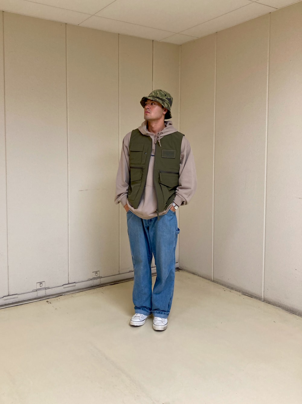 アウトドアっぽく見えるけど白スニーカーを汚したくないため個人的にはアウトドアじゃないコーデ パーカーもベストも可愛いです。