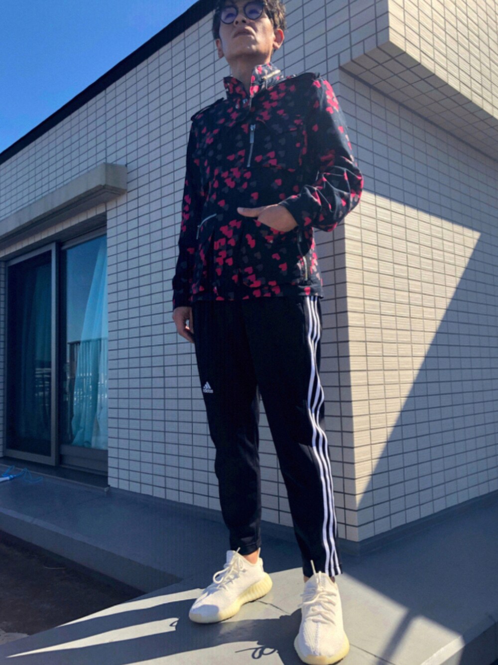 白スニーカーコーデ✌️ 白スニーカーといえば、 このadidas yeezy boost😆 オールホワイトのフォルムが最高です💕 トップスも可愛い💕柄チェックが気に入ってる M51で、数年前に衝動買いしました😆 スポーティーだけど、 可愛く目立ちたい、 そんなコーデに仕上げました👍
