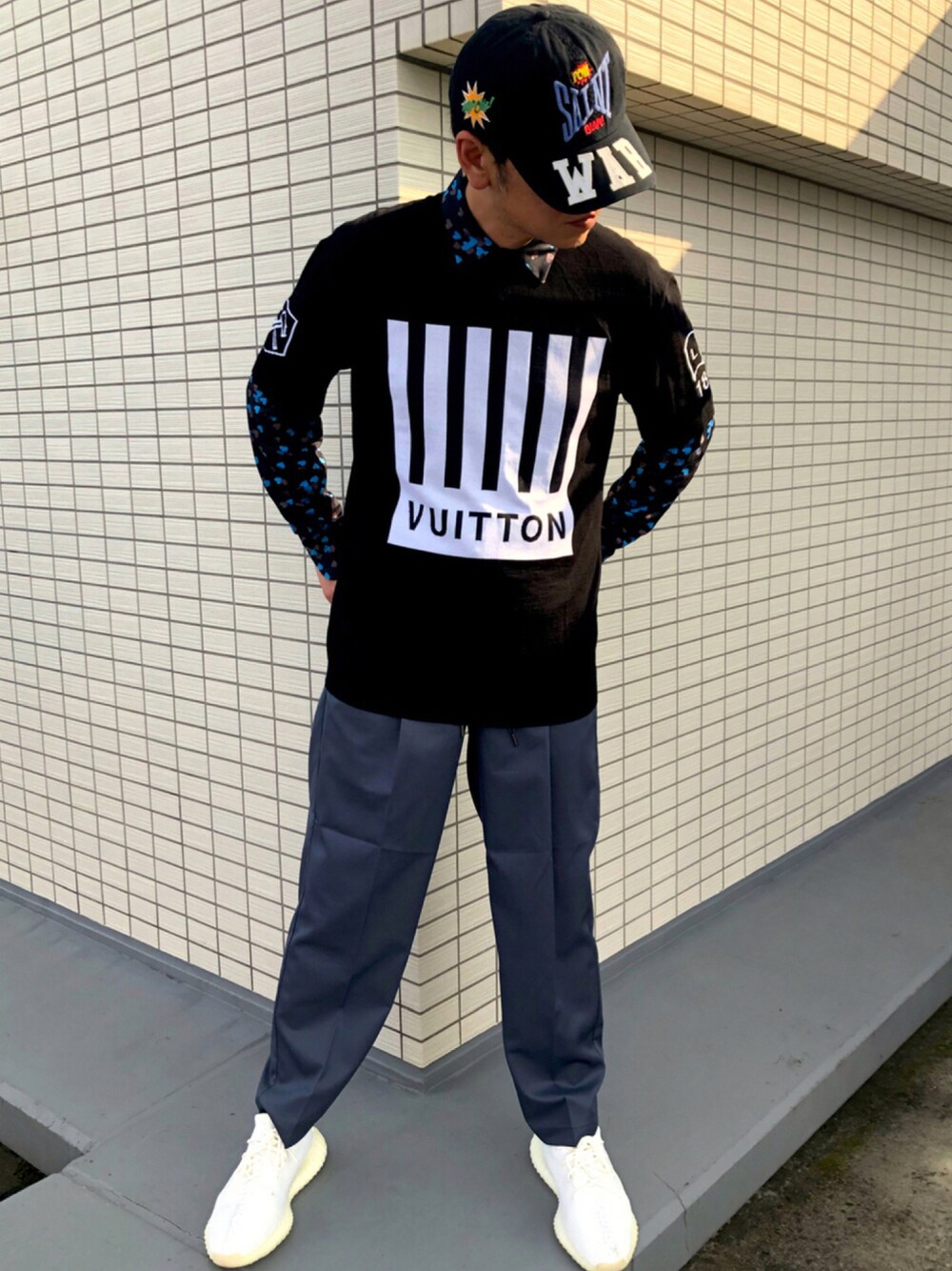BRIGHT THINGSの 💕柄チェックシャツに、 ルイヴィトンの半袖ニットをレイヤード 半袖ニットは、バックの柄もカッコいいです✌️ 良かったら、小窓も見てください🙏 パンツには、グレーを使い、 最後は白スニーカーで、キレイめにコーデしました😆 キャップは、SAINT M××××××の 今シーズンのもので、コーデのアクセントにもってこいです✌️