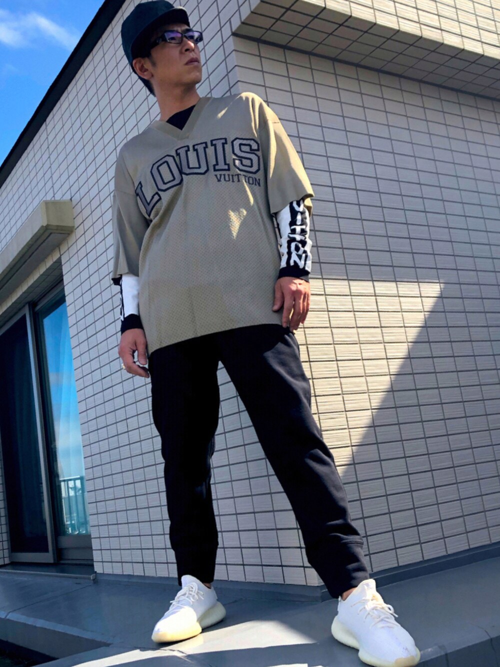 レイヤードスタイルコーデ✌️ ルイヴィトンの半袖ジャージ、ロンTは、キムジョーンズ期のもので、3年前のもの。 ポイントは、ロンTの袖の部分に、 ルイヴィトンのLOGOが入ってる所👍 すこし、バレンシアガっぽい感じのLOGOが好きです! スエットパンツは、 ジルサンダーのもので、サイズ感、ラインがとっても綺麗💕 黒のスエットパンツなので、足元は真っ白なイージーブースト、キャップは黒でコーデにしました✨