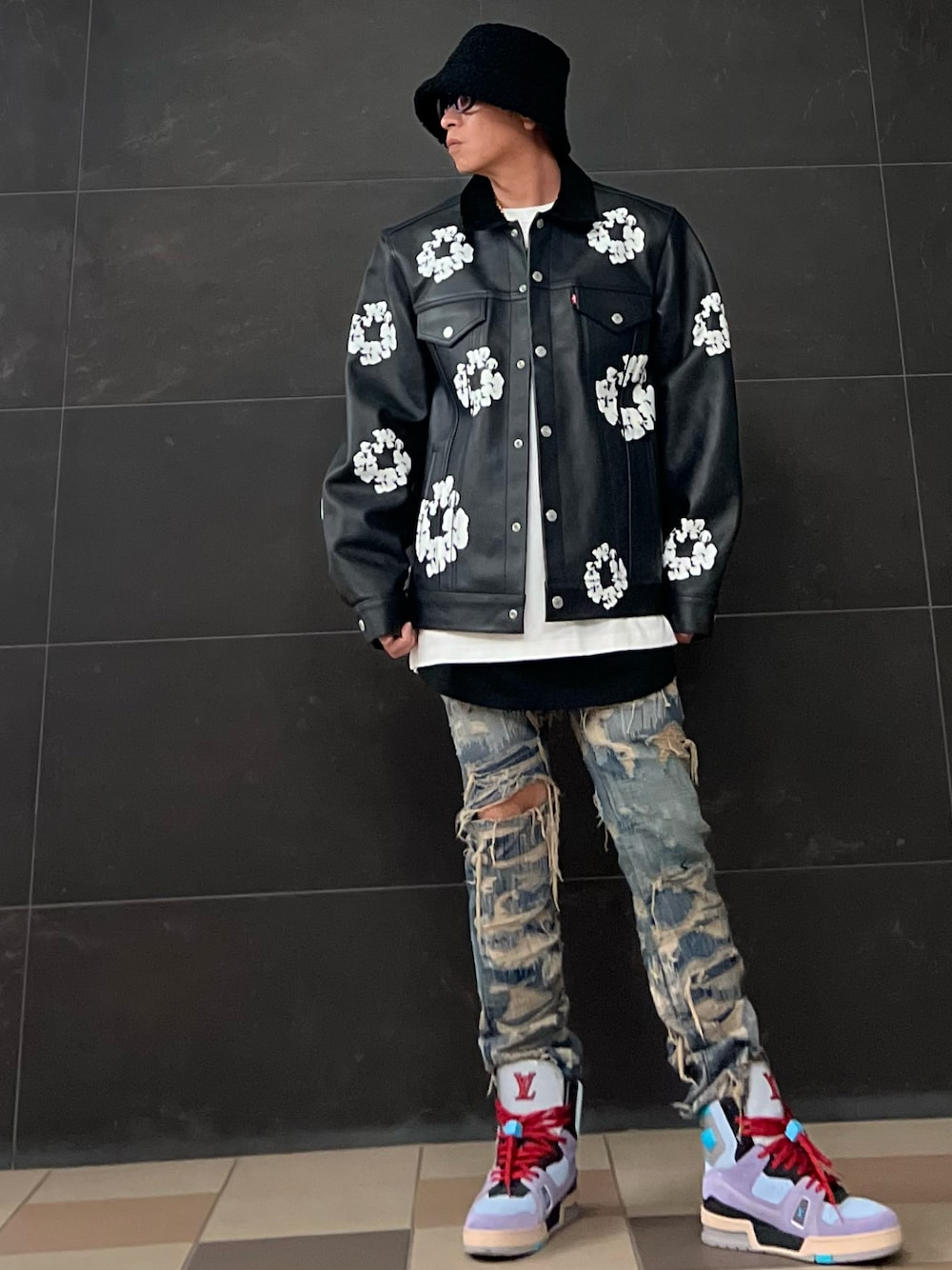 OOTD🎩 レザージャケット→levis×denimtears インナーT白→undercover インナー黒→printstar デニム→undercover スニーカー→louisvuitton Thank you🔥 Take care✨