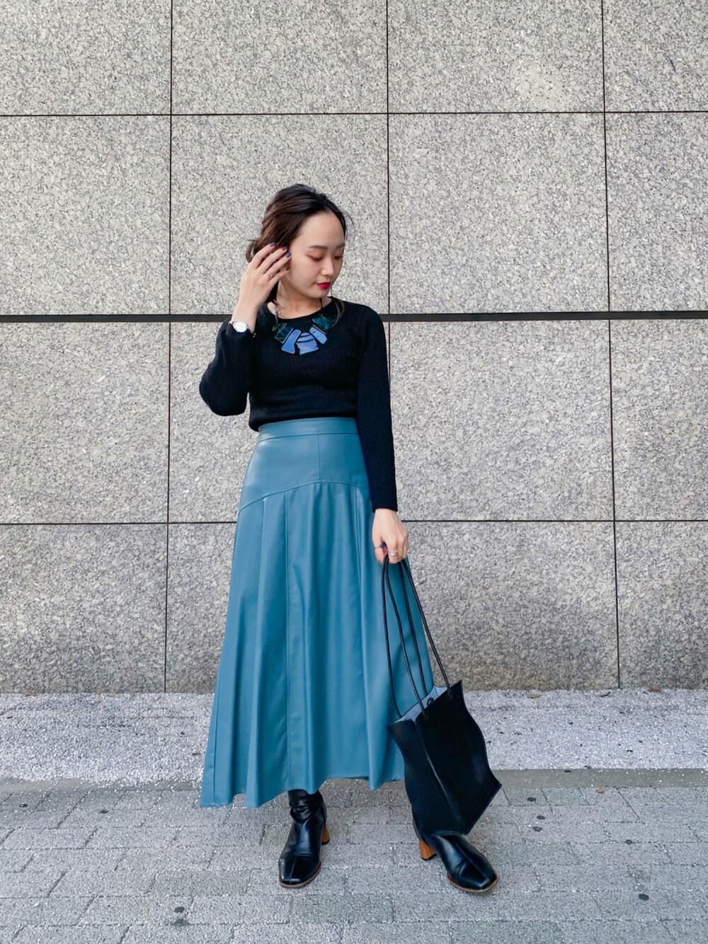 エコレザーのスカートで大人っぽく◎