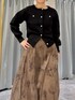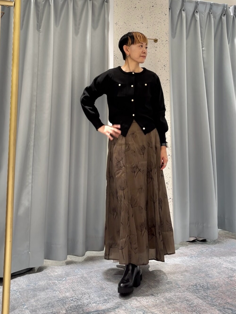 大花プリントが華やかなスカートは軽やかな素材感で、着心地よく、シーズンレスで着回せる。 ニットとも相性良さそう。 ウエストゴムと広がらないデザインで、スッキリ着ていただけます。 カーディガンは、毎シーズン好評の定番アイテム。ブラックで、きれいめコーデに。 ブーツは、厚めのヒール。 履きやすい。