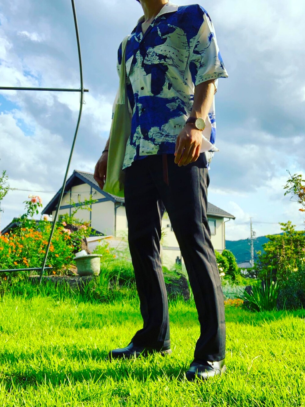 世界地図柄のシャツとフレアパンツのコーデ。 タックインしてもかっこいい!