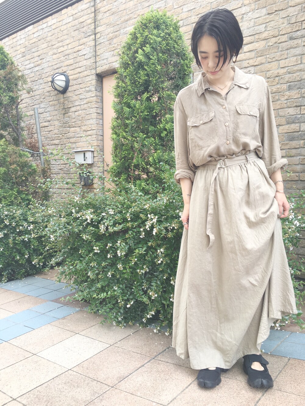 ベージュで合わせて、ワンピース風に🌿🌿 ショートヘア×大ぶりピアスのバランスが好きです☺︎