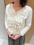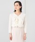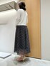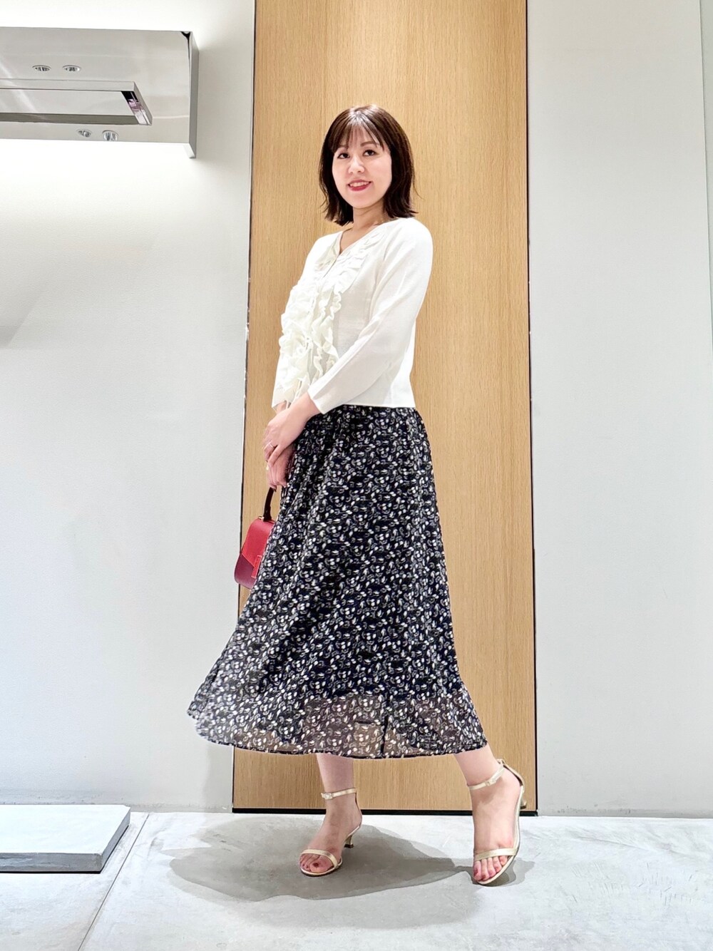 フリルが可愛いカーディガンをトップスとして着用しました。 フロントのフリルが華やかな印象です。 胸元にボリュームが出そうですが、立体感が出てスッキリとした見え方の仕様になっています。 着丈もコンパクトでバランスとりやすいです。 ニットですがサクサクとした素材感で、真夏も爽やかな肌触りです。 これからの時期に活躍する、ご自宅で手洗い可能な素材なのも嬉しいポイント。 合わせたスカートは、フェミニンなモノトーン調の小花柄プリントを施してあります。 ウエストへふんだんにタックをあしらった、ドラマチックな裾広がりのエレガントなフレアスカートです。 軽く涼やかに着用できるシフォン素材。 真夏にもぴったりです。 シリーズのブラウスとセットアップで着用すればワンピース見えのスタイリングも可能。
