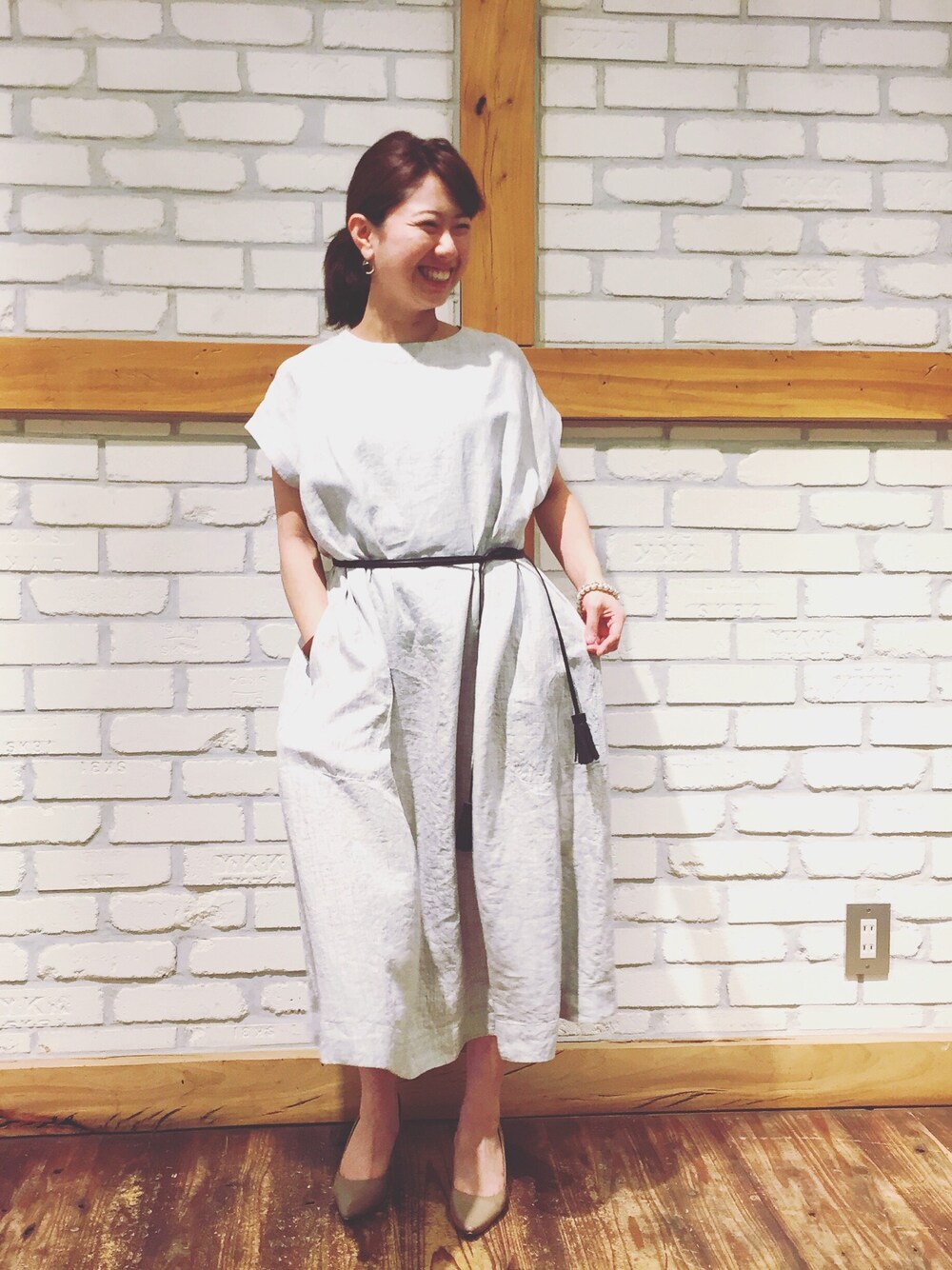 ホワイト系のワンピース、ブラウン系のベルトを着用したレディースの夏コーディネートの1枚目の写真