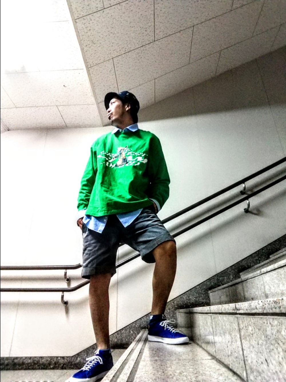 みなさん今日の2回目の投稿よろしくお願いします🙇⤵️ 朝に使ったUNIQLOスケーターコレクションのロンTで次は、スケータースタイルなコーデにしました😄 朝は可愛いを目指しましたが、今回はお洒落なスケーターを意識しました✨ コーデのポイントはシャツとロンTの重ね着です🥰レイヤードにすることで、こなれ感になりますしバランスが良い感じになります😍 レイヤードの時は下のレイヤー部分をどれだけ見せるか⁉️に好みが出ると思いますけど、自分はこれぐらいの感じのバランスで作れた時がかなり満足です✨ トップス緑なので挟むようにバケハとスニーカーと靴下は青系にしてみました😁 グラデーションになって良い感じなのではと思っております🎵 そして、昨日あたりから昼も急速に体感温度下がってきました😅 がハーフパンツ好きなので✨ まだしばらく長袖×ハーフパンツなスタイルを楽しみたいと思います😄✌️ では本日2回目の投稿にお付き合いありがとうございました🙇♂️ そして今日は“アンソニー”さん投稿で、めっちゃ美味しく、イジって貰えて嬉しかったです🥰✨ この時間に2回目と投稿という事は…です 今日だけアンソニーさんの最高のフリを使わしてもらって夜に3回目の投稿します🤣 お楽しみに🙋