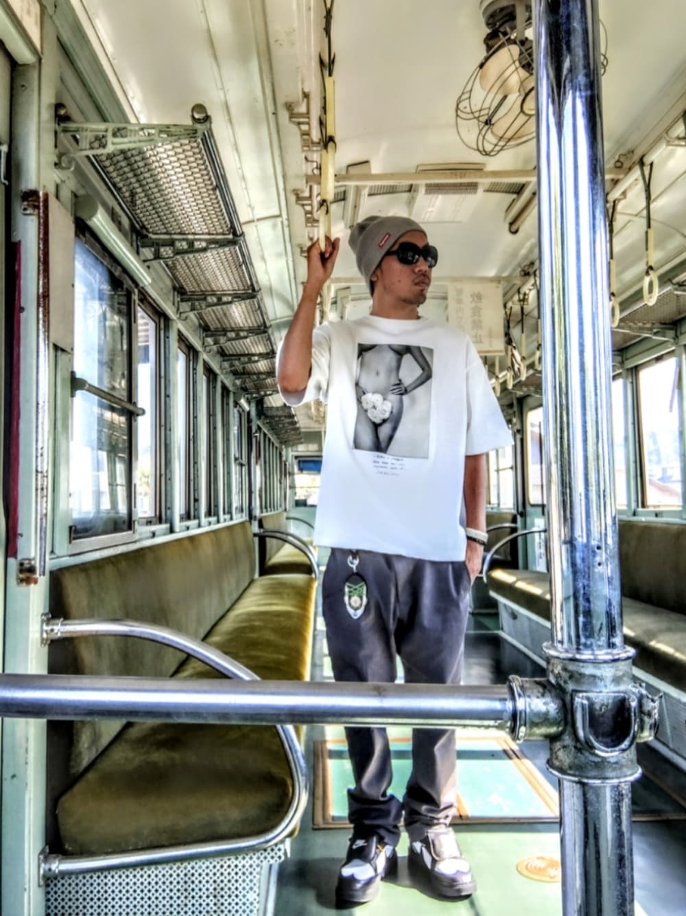 みなさんいつもありがとうございます😁 #トリックアートフェス参加投稿よろしくお願いします🙇 今回は行きつけの公園に展示されている使われなくなった琴電の車両で電車に乗ってる人っぽく撮影した部分&靴のアウトソールのくぼみがデイジーの花になっていて(画像2参照)砂浜や雪道を歩くと足跡が花になり✨ 歩くと花を咲かせられる点でトリックアートとして参加させてもらいます😆 トップ画は思いがけず芸術点の高い写真になってめっちゃ気にいってます😳 コーデは黒、白、グレーのモノトーンのバランスが上手く決まった点がポイントです🎵 Tシャツの個性を上手く生かせたコーデとなりました✨ ではみなさん今日も良い1日を🙋