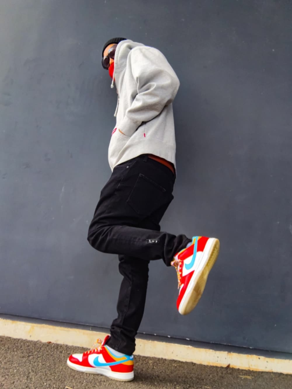 今日2回目の投稿失礼します 2回目はおNEWのスニーカーを使ったコーデ このスニーカーはNIKEとフルーティペブルスのコラボモデルで フルーティ ペブルスとはNBAの"キング"ことレブロン・ジェームズの大好物とされるシリアルの事です なのでヒール部分にはキングの王冠の刺繍がされてます (小窓参照) コーデはモノトーンをベースにジップパーカーのフェイスマスク部分とスニーカーの赤リンクをアクセントにしました✨ 画像3はこのパーカーの紹介の投稿の時に撮り忘れていた フェイスマスク×フードオンの完全防御形態です🤣 画像4はスニーカーメインのショットです 可愛い系のスニーカーの瞬間の映えって最強ですよね🎵 って事でタイトルは可愛いは正義にしました ではみなさん良い午後をお過ごし下さい😌