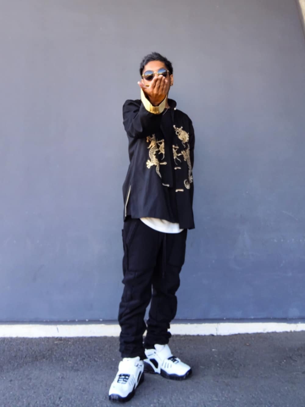 みなさんいつもありがとうございます😁 今日はカンフーストリート カンフーとストリートを融合させる意識でカンフーっぽさを出しつつストリート感を出した点がポイントです✨ 髪を切ったので久しぶりにセットしたくなりヘアスタイルも含めて全体をまとめました モノトーンメインの配色にチャイナジャケットの刺繍と袖のゴールドが差し色です🐉 あえてハイテクスニーカーを持って来た所がこだわりポイントで、TPOも考えていてジャケットを脱ぐと画像3のシンプルな形態に変化します✨ 画像4はカンフー映画のエンドロールのNGシーンを意識して NGショットの高すぎる「抱拳礼」です🤣 ちなみに抱拳礼とは 中国武術における伝統的な挨拶で、右手を拳にして左手の手の平(指を揃える)で包み込むように胸の前で合わせる作法の事で 「文武両道」や「文が武を制し平和を願う」意味合いがあるらしいです 民明書房刊「抱拳礼〜武と調和〜」より ではみなさん今日も良い1日を🙋