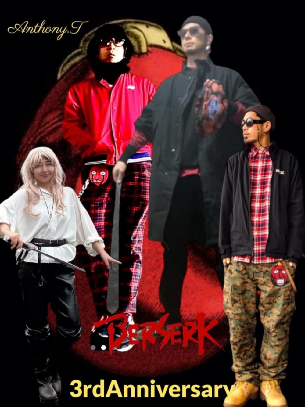 みなさんいつもありがとうございます😁 今日はベルセルクコラボでアンソニーさんの3周年のお祝い投稿です✨ アンソニーさんのベヘリットを使ったコーデに合わせて自分は赤チェック&ベヘリットリンク モミーは骸骨の騎士でトッシーはグリフィス つまり……… アンソニーさんの3周年を記念してみんなで蝕を行ったってわけです☝️←言いたいだけ🤣 画像1がお祝いコラ画 画像2が自分とアンソニーさんの2ショットコラ画 画像3がリアルコーデ 画像4がボーナストラックで骸骨の騎士の馬までセルフで自分でするモミーのプロ魂コラ画 となってます アンソニーさん3周年おめでとうございます🎉✨️ これからもお洒落なコーデは勿論、サブカルや雑学満載の投稿文を楽しみにしてます🥰 そしてコラボで一緒にお祝いしてくれたトッシー&モミーありがとうだよ😁 ここまでしておいて3周年の日にち間違えてたらすいません🤣 ではみなさん今日も良い1日を😊