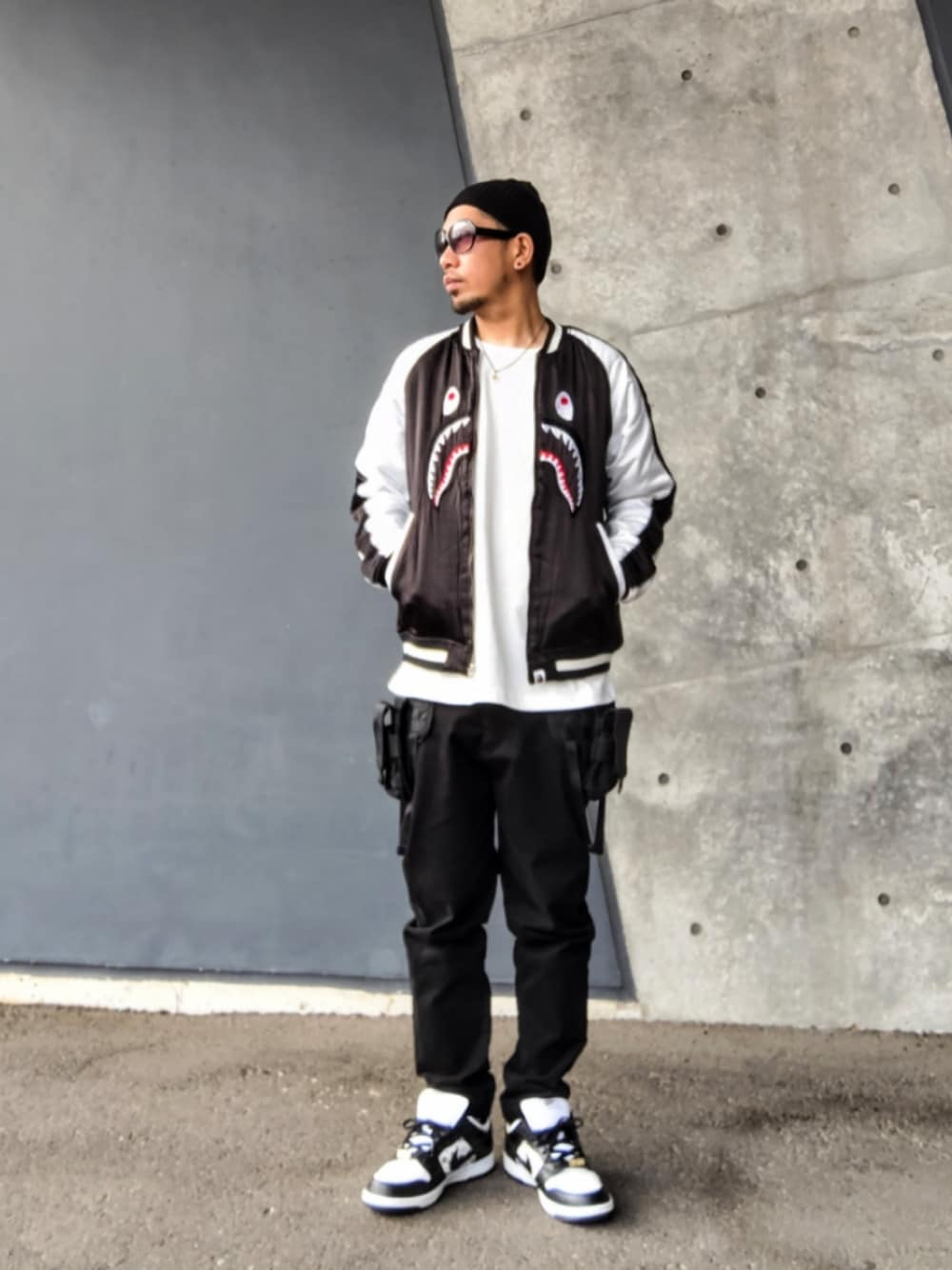 みなさんいつもありがとうございます😁 今日はスーベニアジャケットでモノトーンストリート 白黒のモノトーンでまとめてジャケットのシャーク刺繍とスニーカーの星柄をアクセントにした点がポイント スニーカーにBAPESTAの星柄じゃなく…… あえてSupremeの星柄を持って来た所がこだわりです✨ ビーニーは片耳は出して片耳はニットの中に入れて斜めに被るHIPHOPな被り方をしてます ジャケットは少し前の投稿で店舗で試着させて貰ったやつをそのままお買い上げしました🤭 この時期はサッと羽織れるライトアウターあると便利ですからね ↑って自分に言い聞かせて買いました🤣 ではみなさん今日も良い1日を😊