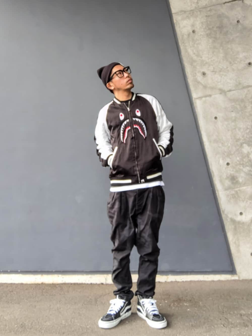 みなさんいつもありがとうございます😁 今日はスーベニアジャケットで春コーデ 全体のカラーをモノトーンにまとめて、そこにパンツの無彩色のカモ柄とスーベニアジャケットのシャークをアクセントにした点がポイントです レイヤードはタンクトップと黒Tと重ね着しています そうする事で首元はTシャツの黒が見えて、裾はタンクトップの白が見える事でジャケットとの配色のバランスを整えました✨ 伊達メガネとSK8-HIは『こなれ感』狙いで合わせました🤓🛹 タイトルはサメにまつわるタイトルが思いつかず…… 鮫肌男にしました😂 厳密には 『余裕しゃくシャーク』ってつまらない駄洒落タイトルを思いついたんですが それは自粛しました🤣 ではみなさん今日も良い1日を😊