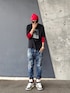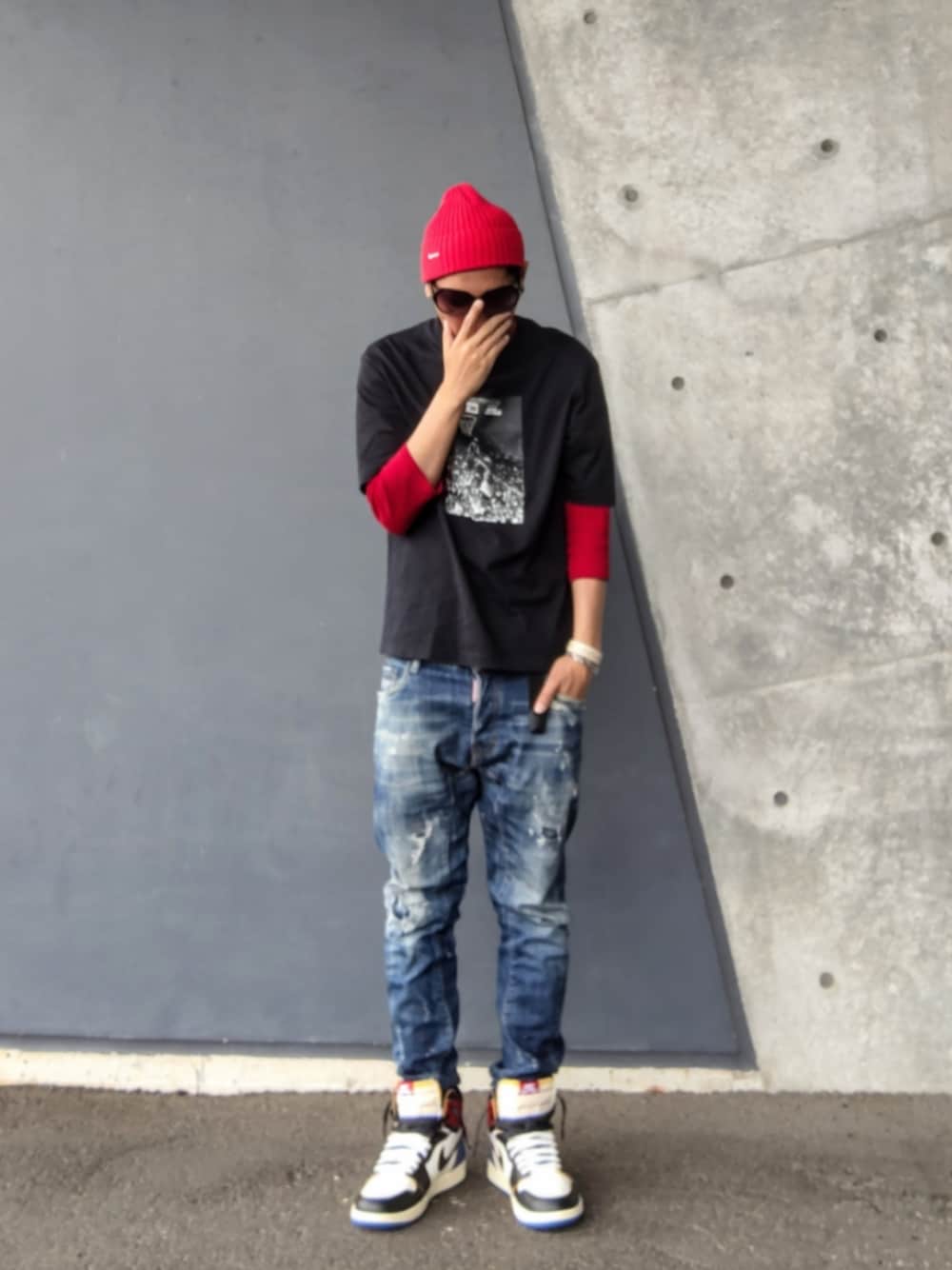 みなさんいつもありがとうございます😁 今日は赤黒でタイトなストリートコーデ Tシャツ×七分袖Tシャツで赤黒のコントラストを意識したレイヤードと七分袖を生かして手首周りのアクセントにブレスレットを重ね付けした点がポイントです✨ 画像2は急なにわか雨に途方に暮れてるポーズ🤣 新品のスニーカーの日に限って予報外れの雨が降る… あると思います☝️ 予報外れの雨に打たれて泣き出しそうでした😭 (天体観測の歌詞を使いたいだけ🤣) 今日も忙しくコメ閉じです ではみなさん今日も良い1日を😊