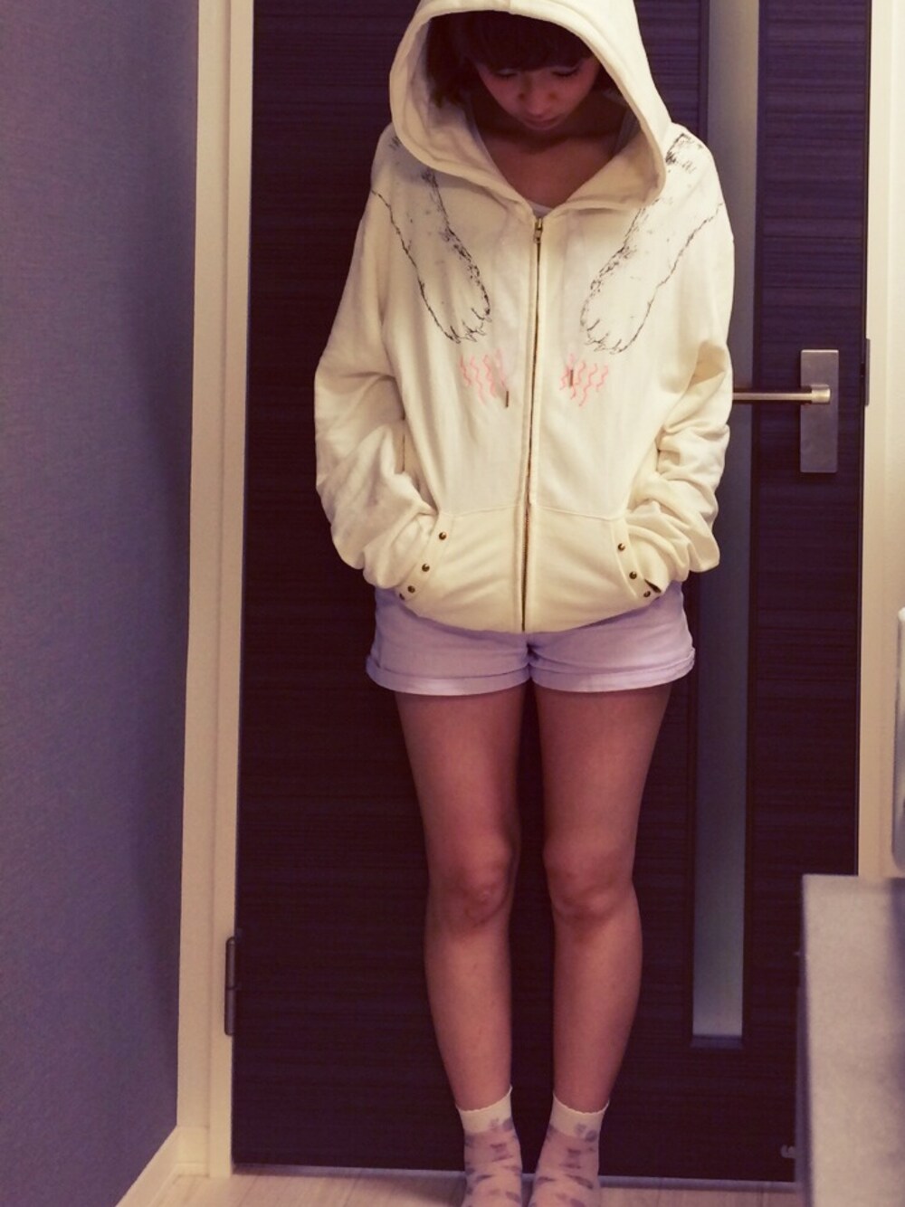 ねこの手のパーカー🐱 ハイウエストショートパンツ どっちもjouetieでした。よく見ると靴下もねこ柄です🐱 KANA-BOONのライブ観にいってきました(^O^) 雨ふってて肌寒かったからパーカー着た。
