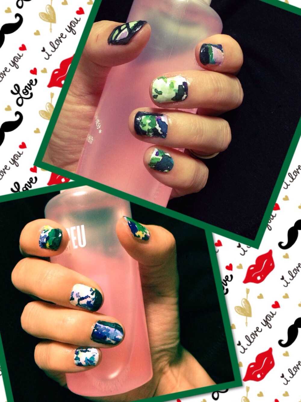 明日お出かけするのでネイルしました★ 100均のネイルシールとマジョマジョのワカメマニキュアで仕上げました 右手がブルー系 左手がグリーン系 のアシンメトリーで★
