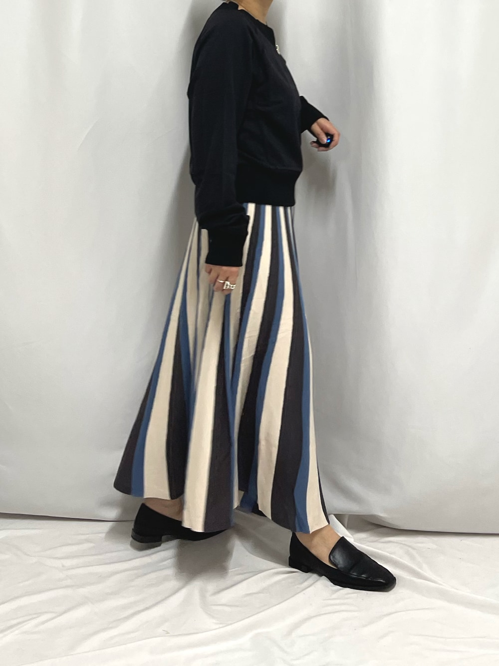 chii(Q manager)のスカート「マルチストライプニットスカート」を使ったコーディネート