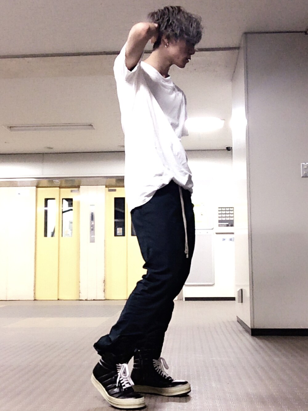 はたCのスニーカー「Rick Owens Panelled Leather High-Top Sneakers」を使ったコーディネート