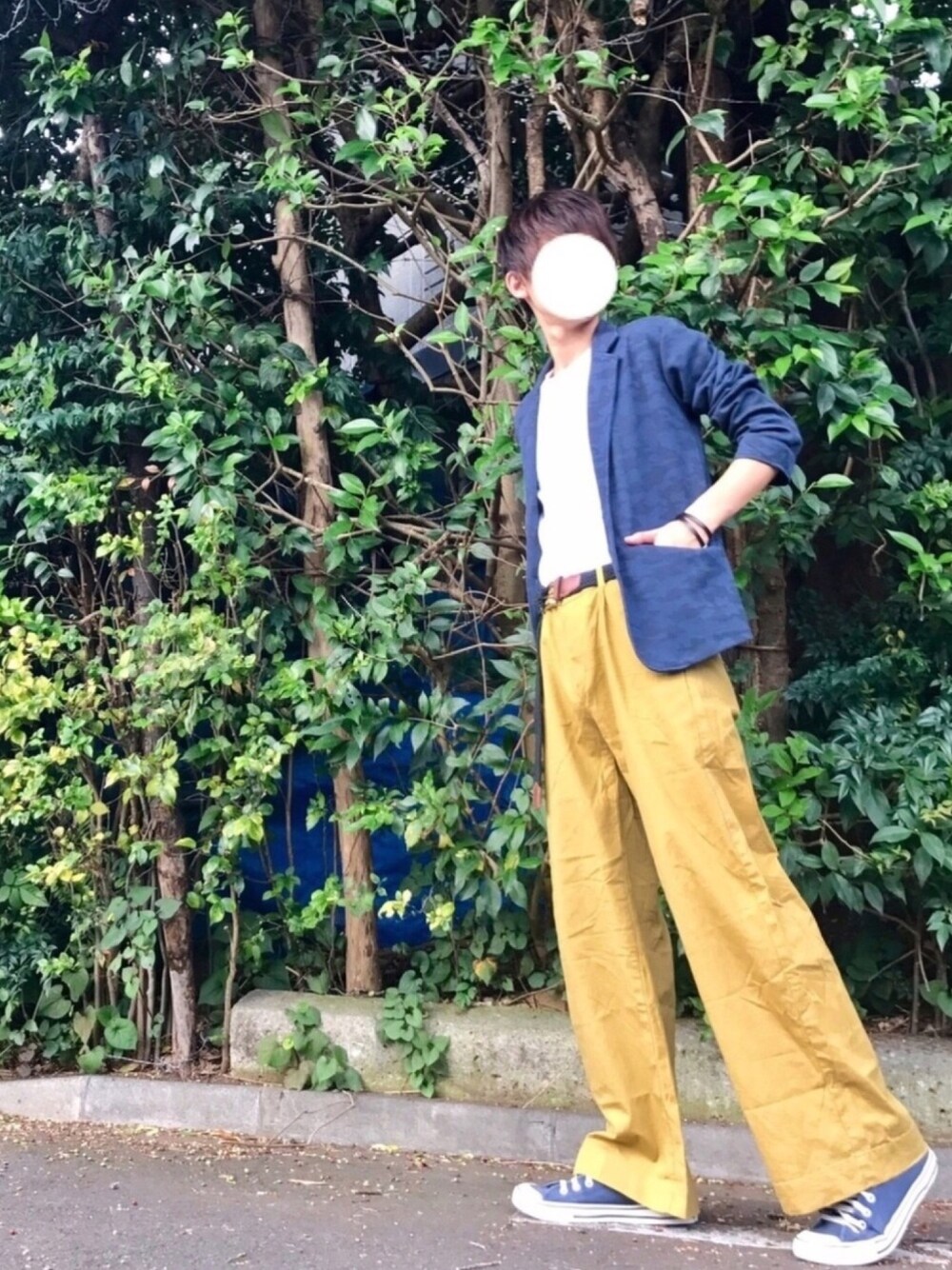 はたひろです🤗 いつも見てくださり、ありがとうございます😃 良かったら今までのコーデも見てみてくださいね(๑⁼̴̀д⁼̴́๑) 昨日のコーデランクインできました✨ ありがとうございます😊 今日はテーラード✖︎ワイドパンツ!! ブルーとイエローで合わせました✨ 結構お気に入りの配色です笑 ポイントはテーラードのブルーとコンバースのブルーでまとまりをもたせて、中心に明るい色を持ってきたことです(๑⁼̴̀д⁼̴́๑) トップスとパンツどちらも明るいので黒のベルトでスッキリとさせました✨ このテーラードは僕が人生で初めて買ったもので、かなりストレッチも聞いてて気に入ってます✨ イエローとブルーの良さが出たコーデになったと思います😃 9月のお気に入りフォルダ公開中です!!!😻 是非是非覗いてみてください^ - ^ 良いと思ったら、いいね❤️コメント📝フォローお願いします✌︎ それではみなさん良い一日を😇