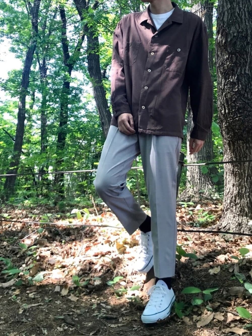 🌽はたひろ🌽です😋 いつも見てくださり、ありがとうございます😊 良かったら今までのコーデ見てみてくださいね(๑⁼̴̀д⁼̴́๑) 前回のコーデランクインできました!ありがとうございます😊 今日は! ブラウンのオープンカラーシャツを使ったシンプルコーデ! このシャツ生地感がサラッとしてて夏でも使えちゃいます🤤 最近結構いろんな人がオープンカラーシャツ着てるので、着こなし差別化したいなぁと思って明るいスラックスに白コンバースを合わせてみました🌟 このパンツのシルエットやっぱり最高🤤 新フォルダ公開しました!😋 まだご覧になっていない方、是非見てみてください 🌟 良いと思ったら、いいね❤️コメント📝フォロー是非お願いします🤲 それではみなさん良い1日を😊 お問い合わせ→hatahiro.wear1997@gmail.com