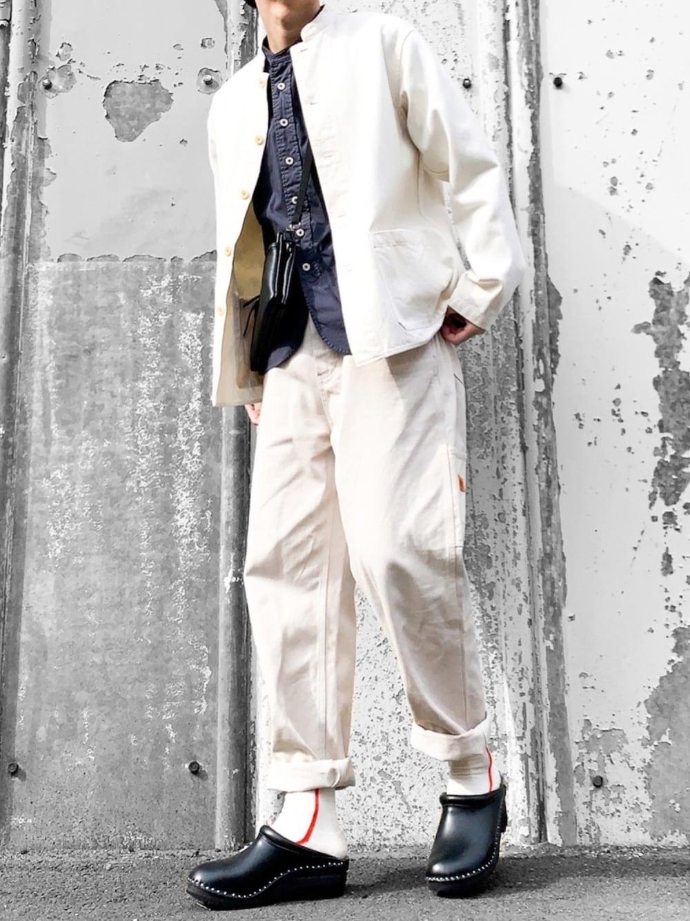 白のセットアップ風コーデ パンツの横からのシルエットが好き