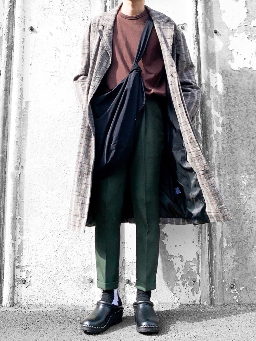 チェックコートコーデ🧥 グリーンのスラックスがいい味だしてる