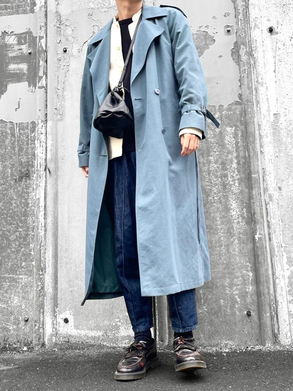 はたひろです🙋♂️ 今日はブルーのトレンチコーデ🫐 初挑戦の巾着バッグ!!これかなりいいです🤤 高級感があって撥水性も🙆♂️ さらにハンドバッグとショルダーの2WAY仕様なので気分に合わせてコーデに落とし込める! ショルダー部分を外しておしゃれな巾着バッグにもできちゃいます🤤 レザーの質感がかなりお気に入りです🙋♂️ コーデのワンポイントに! 全体的にブルーなコーデでした👏 破格なので是非チェックしてみてください👀 よかったら他のコーデも覗いていってください👀
