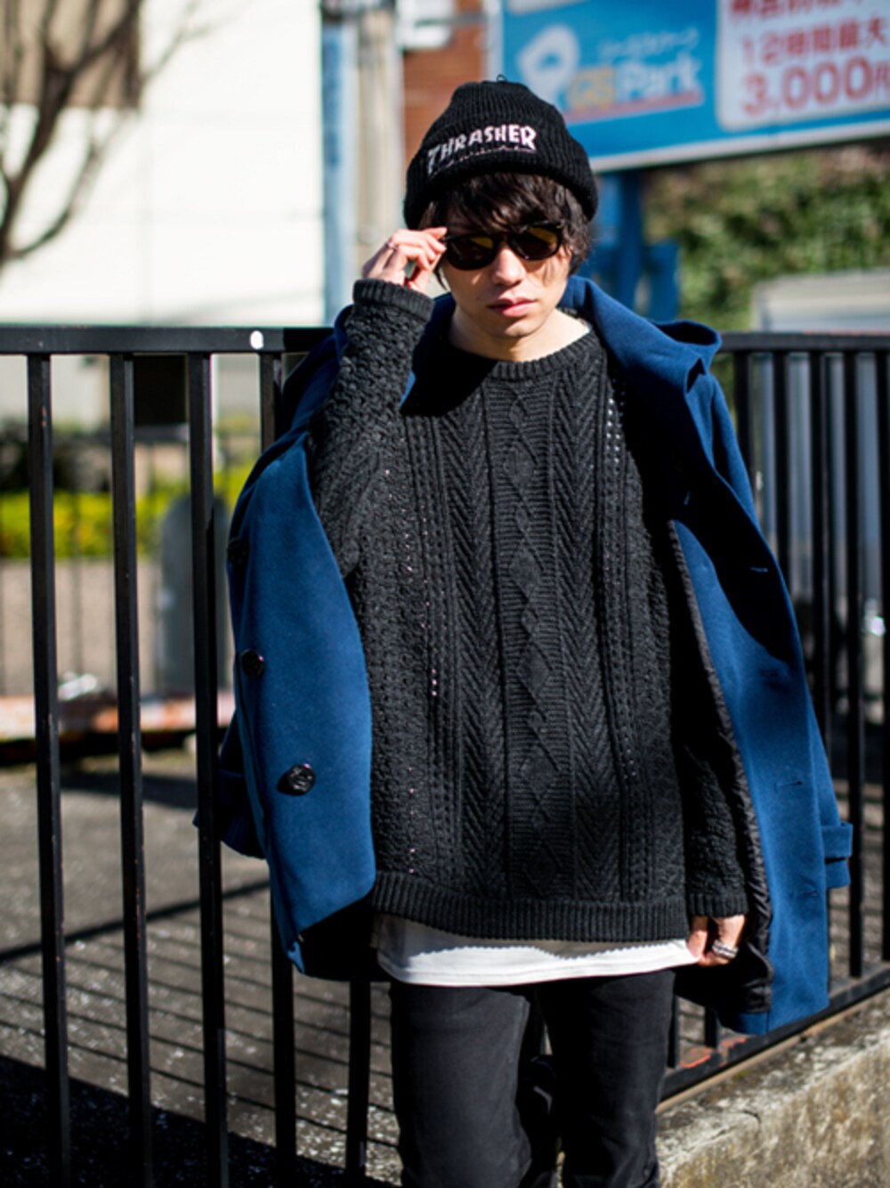 トップスはおもいきりビッグに、ボトムスはタイトに纏めた強弱あるスタイルです。 ケーブル網のざっくりしたビッグニットに、着丈を長めに設けたカットソーを。 Blueの美しいカラーが映えるビッグシルエットPコートが黒で纏めたスタイルにマッチします。