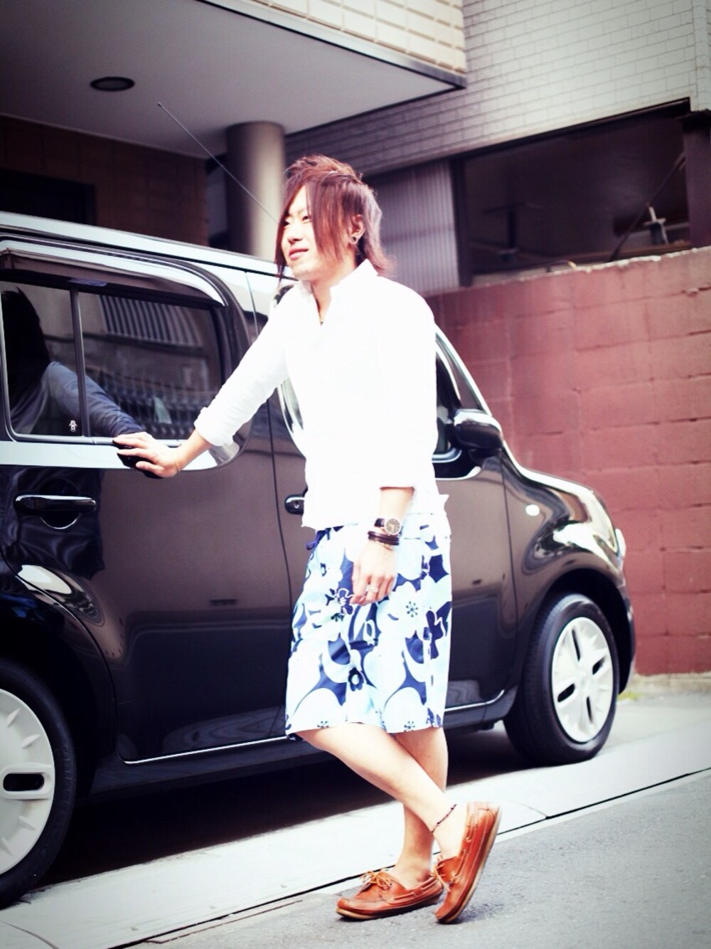 Free&Easyのサーフパンツを街履きしたコーデ。 白シャツと総柄のコントラストがポイント。 商品URL:http://item.rakuten.co.jp/freeeasy/swm-m-13-ns-2598-12/