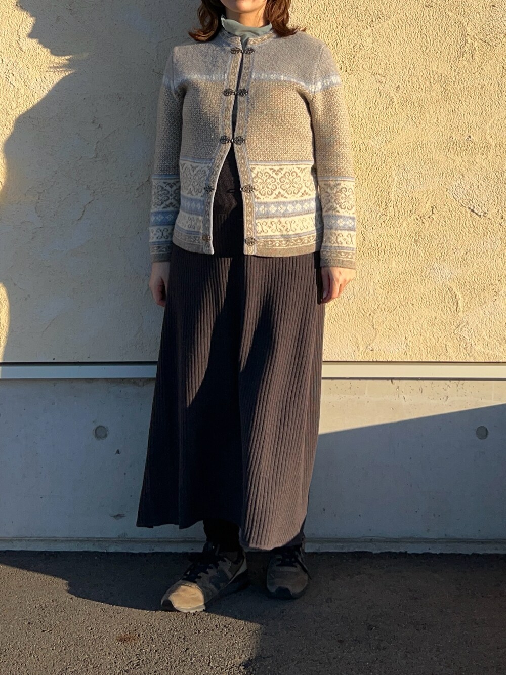 古着屋で購入したカーディガン、優しい色合いとメタルフックがツボ♡ お腹ぽっこりで締められないけど、🤰期間も楽しみたい♡