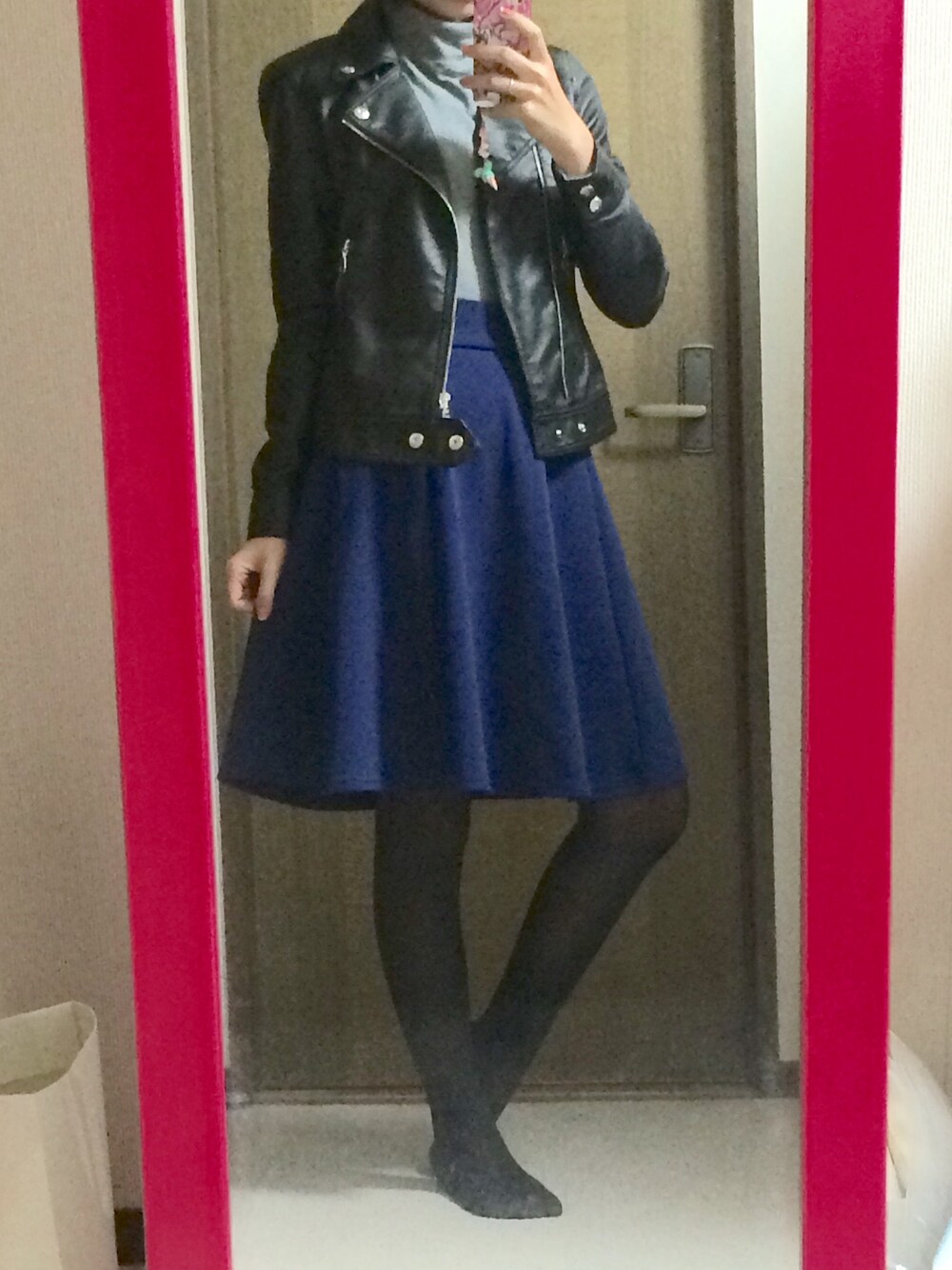 ミモレ丈スカートにライダースを合わせて 大人ロックなスタイルに٩( 'ω' )و インナーをインしてハイウエストに♡ 脚長効果狙ってます♪♪♪