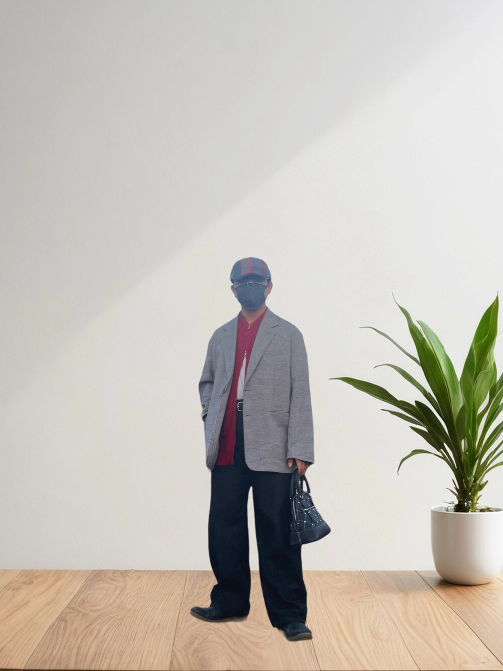point ・ベストのネックとハンチングで顔周りの印象を強めた ・黒デニムでラフさを加えつつレザーやアイウェアなど小物で上品さを与えた