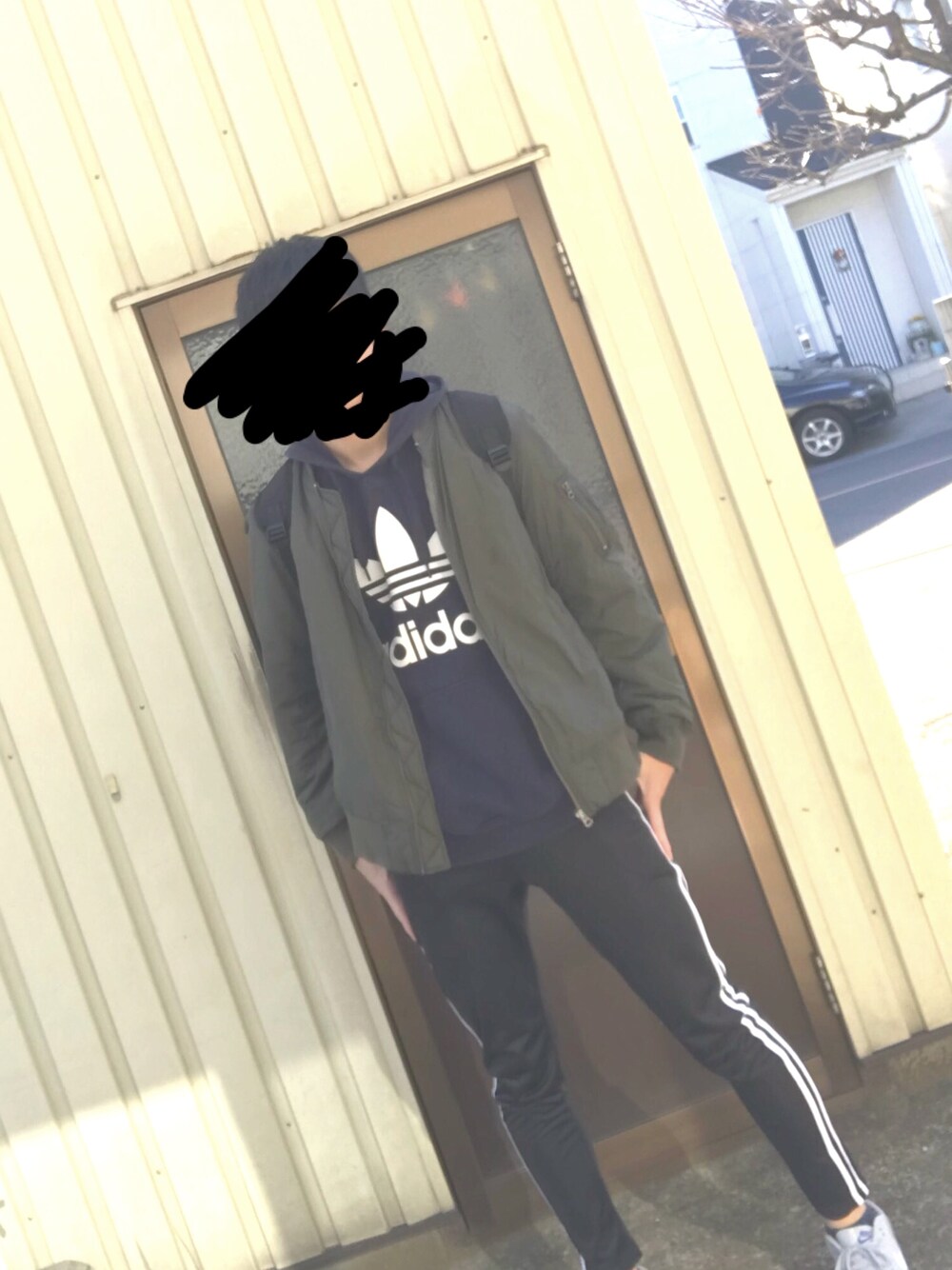 ストリート系を意識した服装 アディダスのパーカーがポイント