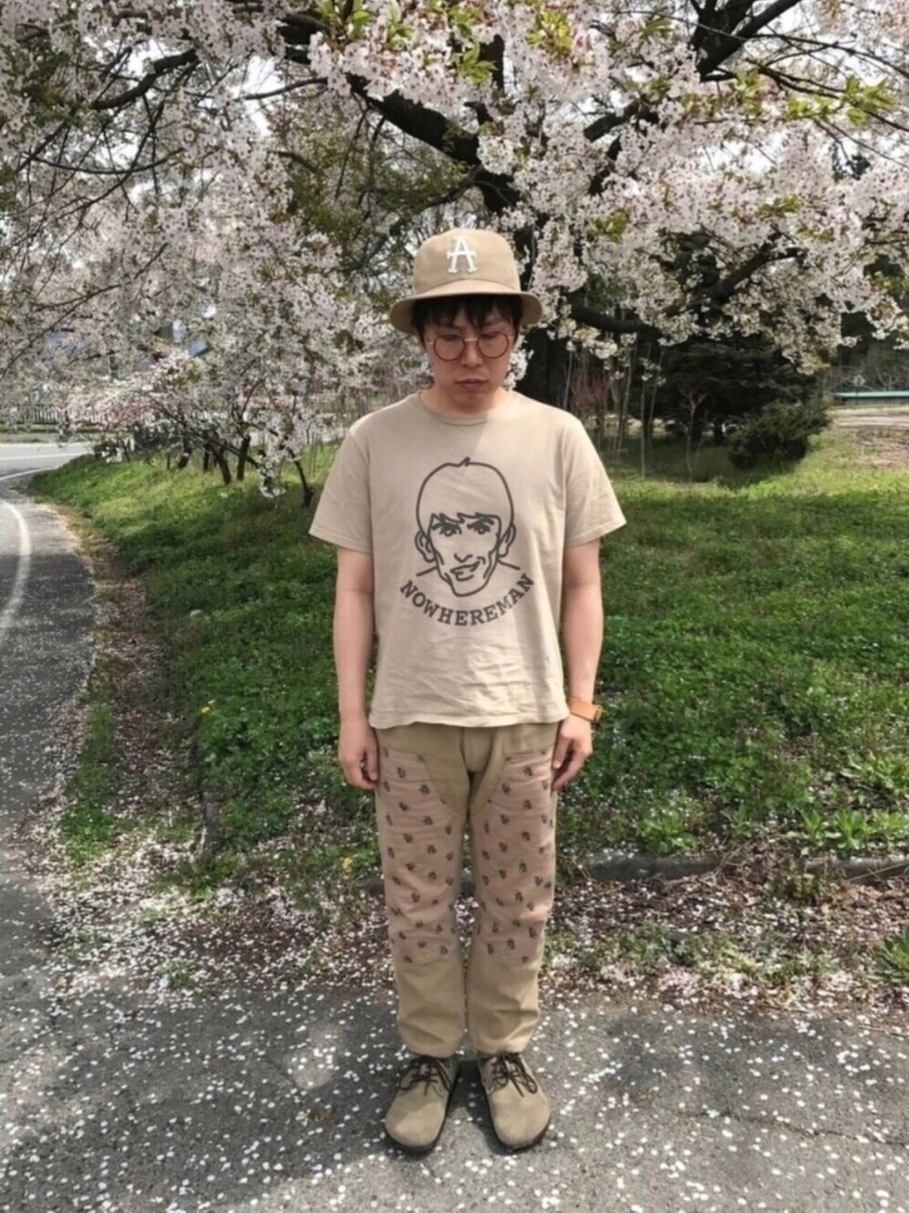 こんにちは お気に入り、いいね、フォロー、ありがとうございます。 5月だと言うのに桜が咲いていました。 Tシャツだとまだ少し肌寒く感じます。 今回はベージュでまとめて見ました。 エイプのボトムスはももから膝にかけての プリントが気に入ってます。 読んで頂きありがとうございます。 よろしくお願いします。