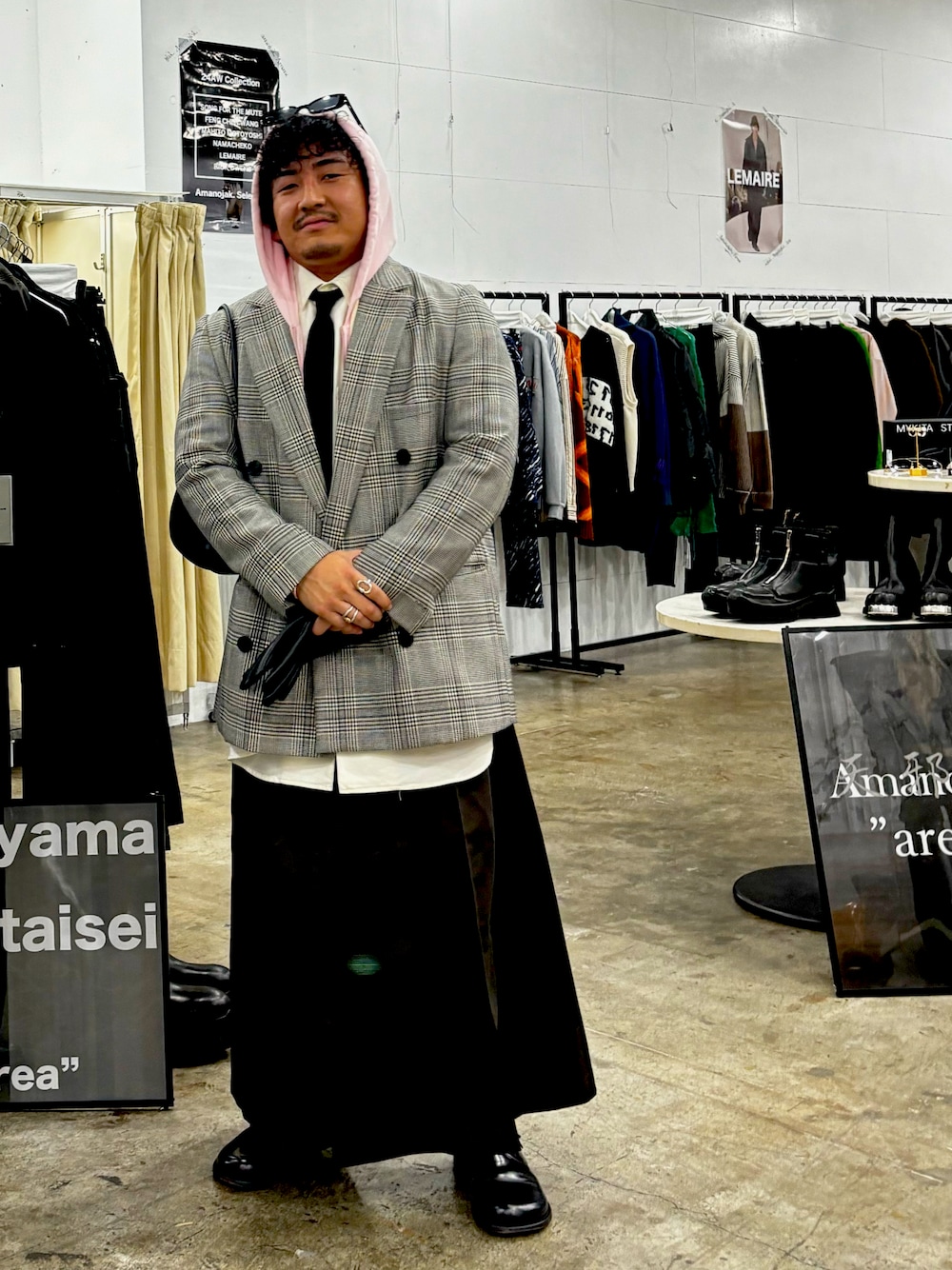 TAISEIさんのPOP UP行った時のコーデ。 リコールのパンツがポイント! 差し色ピンク選びがち。