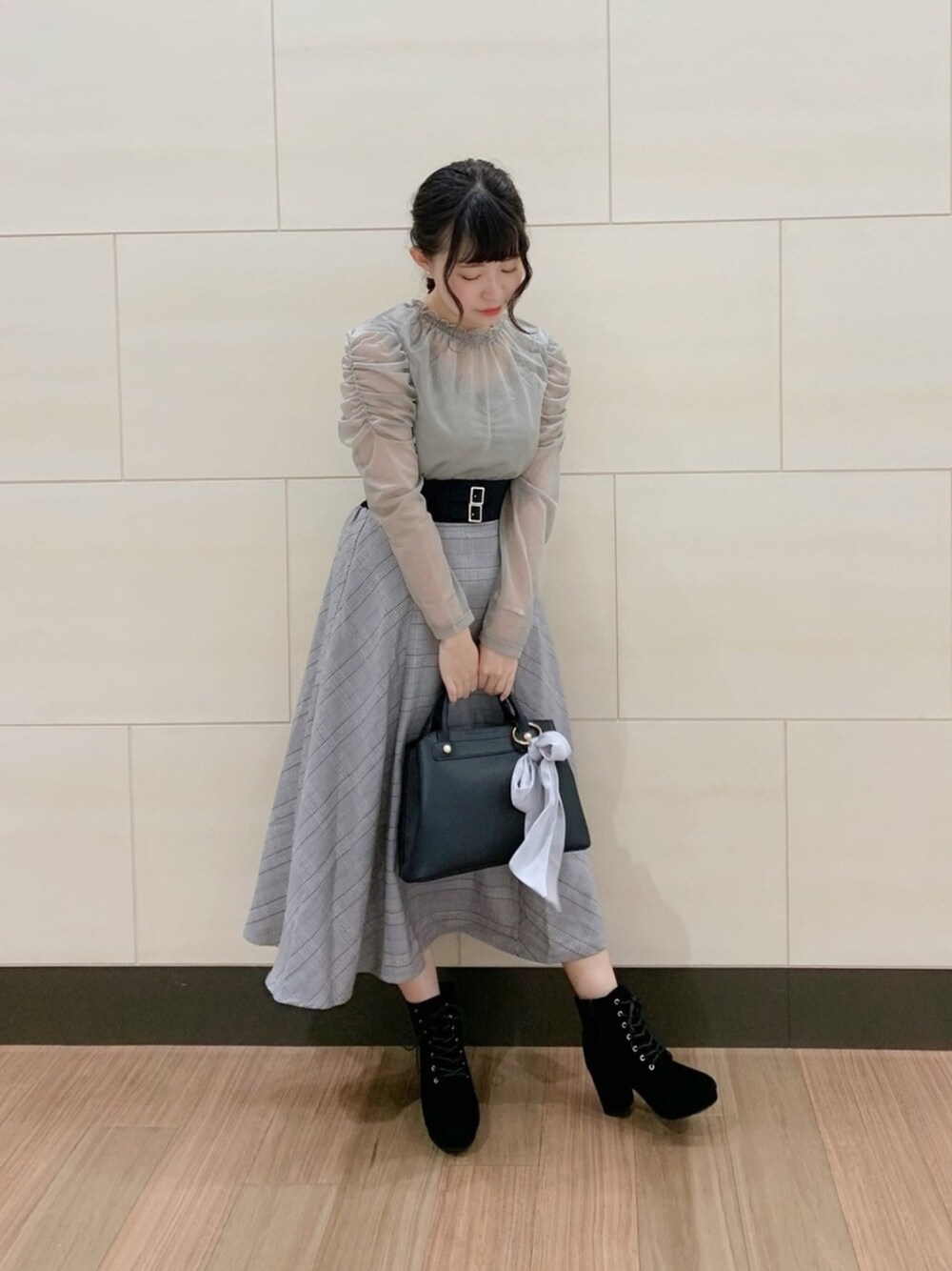 コルセット風デザインのフレアスカートはファスナー無しの後ろゴムで履きやすく、裾に向かって綺麗に広がる美シルエットです✨ ギャザーが入ったボリューム袖がアクセントのラメシアーホイップトップスと合わせて大人コーデに♡