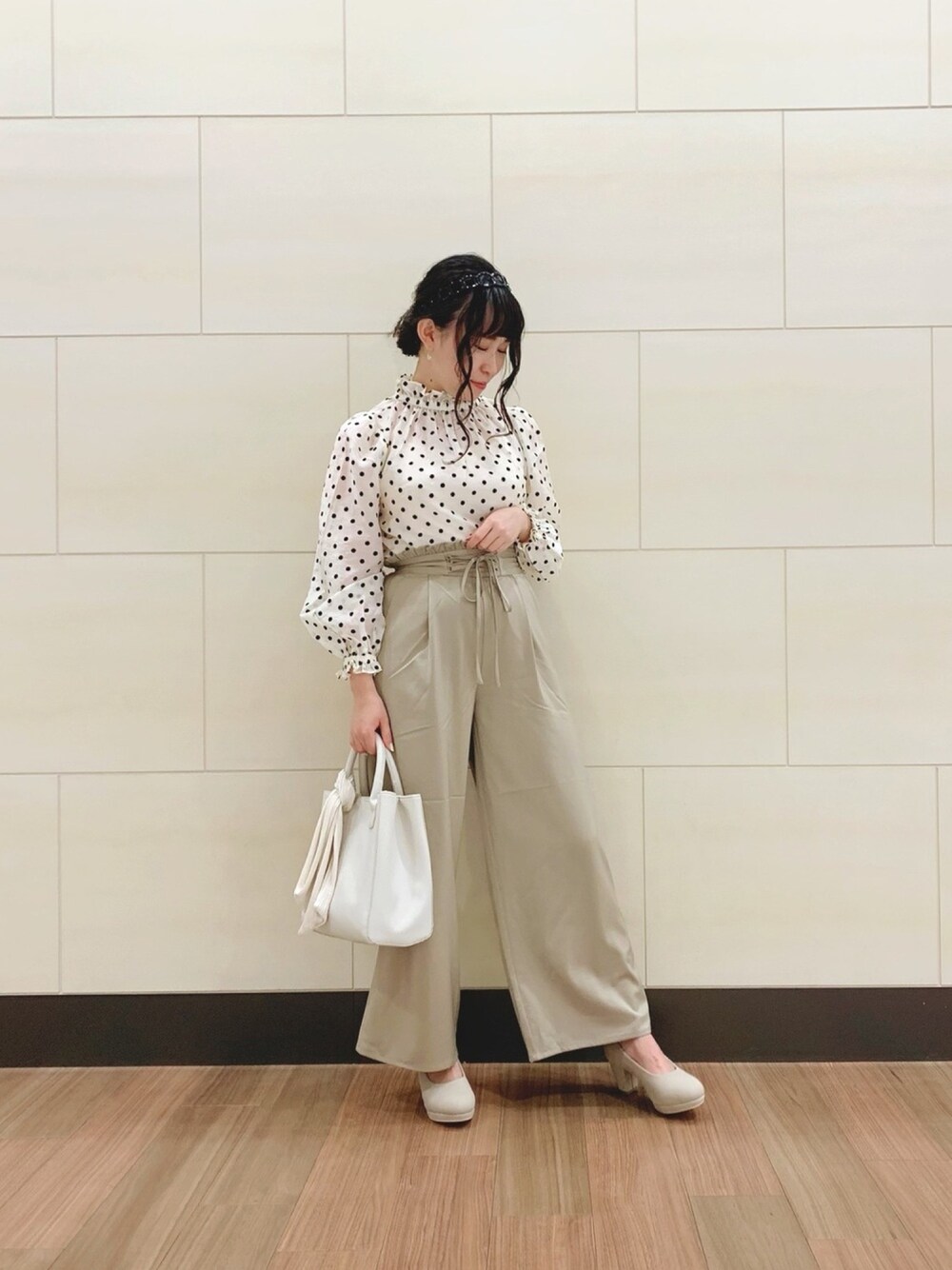 ウエスト部分にレースアップデザインが施されたカラーパンツはサラッとした着心地で、脚長効果もあります👍✨ 少し大きめのドット柄ブラウスと合わせてみました☺️