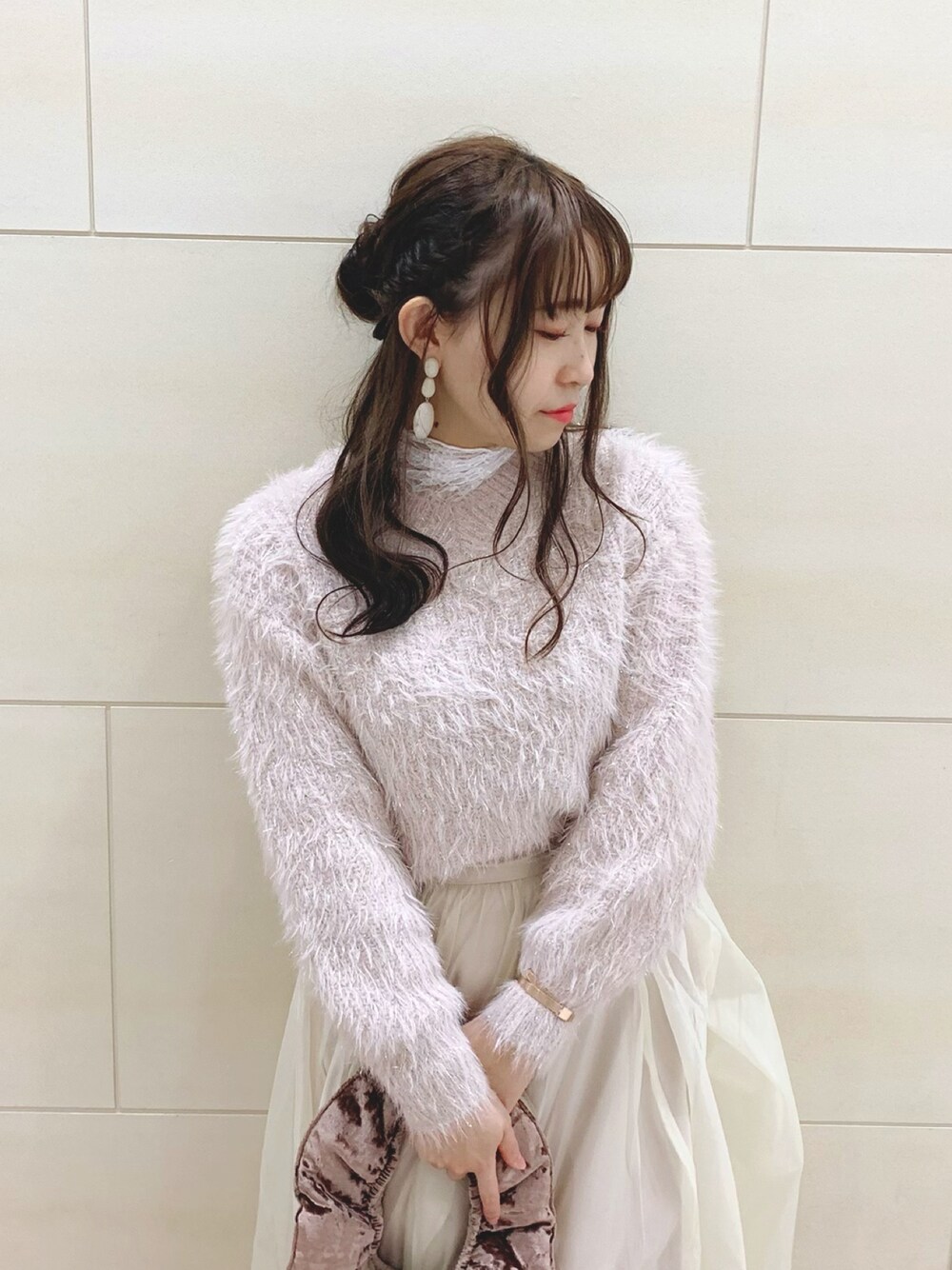 キラキラのラメニットにふんわりスカートでフェミニンコーデ💕