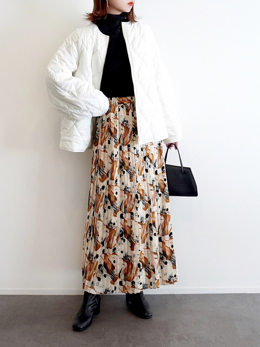 ---PR--- モノトーンにオレンジを効かせた 冬のカラーコーデ🍊 アウターは先日ご紹介した OPAQUE.CLIPさんのものの着回しで、 ダイヤキルティングとショート丈が コーデをたちまち旬顔にしてくれる 万能かつ大人な1枚です。 ほんのり丸みのあるシルエットが さっと着るだけで様になり、 ノーカラーデザインが 上品な印象を与えてくれるので、 カジュアルからきれいめまで 幅広く着こなせます👏 どんなボトムスとも バランスが取りやすい トレンドライクなショート丈や、 取り外し可能なボアライナー付きで ロングシーズン着回せる点など 実用性の高さも大きな魅力。 着回し力抜群の3色展開のうち、 私は秋冬のトーンをパッと 明るくしてくれる「オフホワイト」を 選ばせて頂きました💭 この日は、数年来お気に入りの 柄物プリーツスカートにオン。 存在感のあるアートプリント柄も、 他をモノトーンでまとめることで 大人シックな印象に。 アウターのクリーンで爽やかな オフホワイトの色味が、 こうした柄物とも合わせやすく 着こなしの幅がグッと広がります🌿 PR:OPAQUE.CLIP Instagram ▷ haushinka71