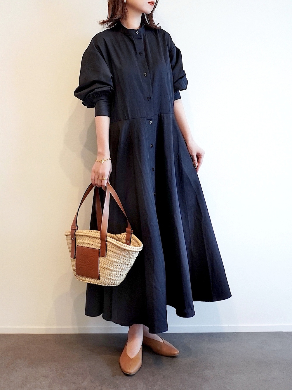 ---PR--- さらりと1枚で様になる シャツワンピースに かごバッグを合わせて夏を先取り…🍋 ワンピースは、先日ご紹介した INTERPLAYさん × MAYUKOさんの コラボアイテムの着回しです。 まさに今時期から ロングシーズン活躍する 長袖のシャツワンピースは、 ふんわりエアリーなスリーブと 上品なフレアシルエット、 きちんと感のあるバンドカラーが魅力。 綺麗なドレープを生む 適度なハリがありながらも、 薄過ぎず厚すぎずのしなやかな生地が 軽やかなニュアンスを 演出してくれます。 合わせ方次第で オンオフ問わず重宝する1枚で、 着脱可能なリボンベルトが 付属しているのも嬉しいポイント。 リボンの有無や 結び目の位置によっても 表情が変わるため、 前回はリボン有りで 着用しましたが、 今回はリボン無しの シンプルなスタイルで 合わせてみました☺️ 美しいシルエットを保ちつつ ポケット付きなのも有難い限り。 私はシックな印象の 「ネイビー」を 選ばせて頂きましたが、 爽やかな「ミント」や 「ライトブルー(ストライプ)」も 春夏にぴったりのカラーで とっても素敵でした…! この日はネイビーと相性のよい キャメル小物と合わせて、 かごバッグの素材感で 初夏を意識しました。 気になられた方はぜひ チェックされてみてください🌿 PR ・INTERPLAY × MAYUKO (@gijigijigijiii) ・stoork Instagram ▷ haushinka71