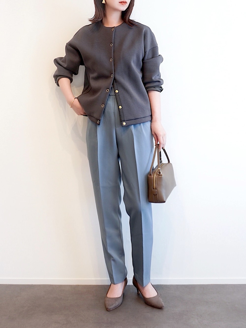 ---PR--- ブルーグレー×チャコールの 大人シックな配色の きれいめパンツスタイル。 ラインの美しさと 着心地のよさ、着回しやすさの 三拍子が揃った万能パンツは、 先日ご紹介した abahouse mavieさんのものの着回しです…! こだわり抜かれた テーパードシルエットと タック入りのデザインが、 気になる太腿周りをカバーしつつ 全体をすっきりと見せてくれる1本。 脚のラインを拾いすぎない 適度なゆとりがありながら、 ウエスト周りがもたつかず ボトムスインでもアウトでも 様になるのも大きな魅力。 それでいて、 ストレッチ性のある生地と ウエストのバックゴム仕様で ストレスフリーに着用できるのも 嬉しいポイントです。 ほどよい厚みの生地は ロングシーズン活躍してくれることに加え、 品のある質感で デイリーカジュアルはもちろん きれいめ、オフィススタイルなど オンオフ問わず幅広いシーンに 対応可能な点も有難い限り…! シリーズの名前通り まさに”感嘆””簡単”な逸品で ワードローブの強い味方となってくれます。 豊富なサイズ展開やシリーズ展開、 着回し力抜群のベーシックカラーから 春らしい綺麗色まで揃うカラバリも秀逸で、 私は爽やかな印象で楽しめる 「グレイッシュブルー」を 着用させて頂きました。 ほどよいくすみ感のある上品なブルーのため、 コーデを明るく仕上げてくれつつも 馴染みがよく目立ちすぎない 絶妙な大人カラーです…! これまではブラウスや シャツ合わせで着回してきましたが、 この日はカーディガン感覚で さらりと羽織れる ノーカラージャケットをオンして オフィスライクに。 シンプルな組み合わせですが、 ジャケットのゴールド釦が 華やかなアクセントを プラスしてくれています。 気になられた方はぜひ チェックされてみてください🌿 PR ・abahouse mavie ・Emma Taylor ・welleg(menue) ・stoork Instagram ▷ fashion,cafe,travel @haushinka71 ▷ interior @___hauhaus (アンダーバー3つ)