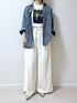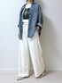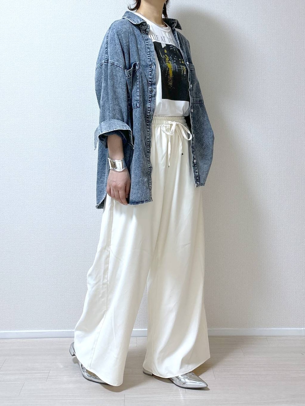 【簡単にスタイルアップができるコーデ】 インナートップスとパンツを同系色にして"Iライン"のスタイルをつくり、トップスのフォトプリントを目立たせると上半身に目線がいきますので、低身長さんにオススメの着こなし方です。 更にシューズをポインテッドトゥにすると、スッキリと見えますので着痩せ効果があるんです💁♀️✨ またボトムスを黒にすると下に重心がいきますので、高身長さんにオススメです! コーデの参考になれば幸いです😊 ウエストゴムでゆったりと穿けるトロミイージーパンツ🩳 紐もありますので調節しやすくなってます。 羽織っているケミカルウォッシュシャツはとにかく着まわせること間違いなし! 厚地ではないので、寒くなる頃にはスウェットトップスやニットの下にレイヤードしても良さそうです😊✨ 秋・冬、そして春の3シーズン使える優秀アイテムです!