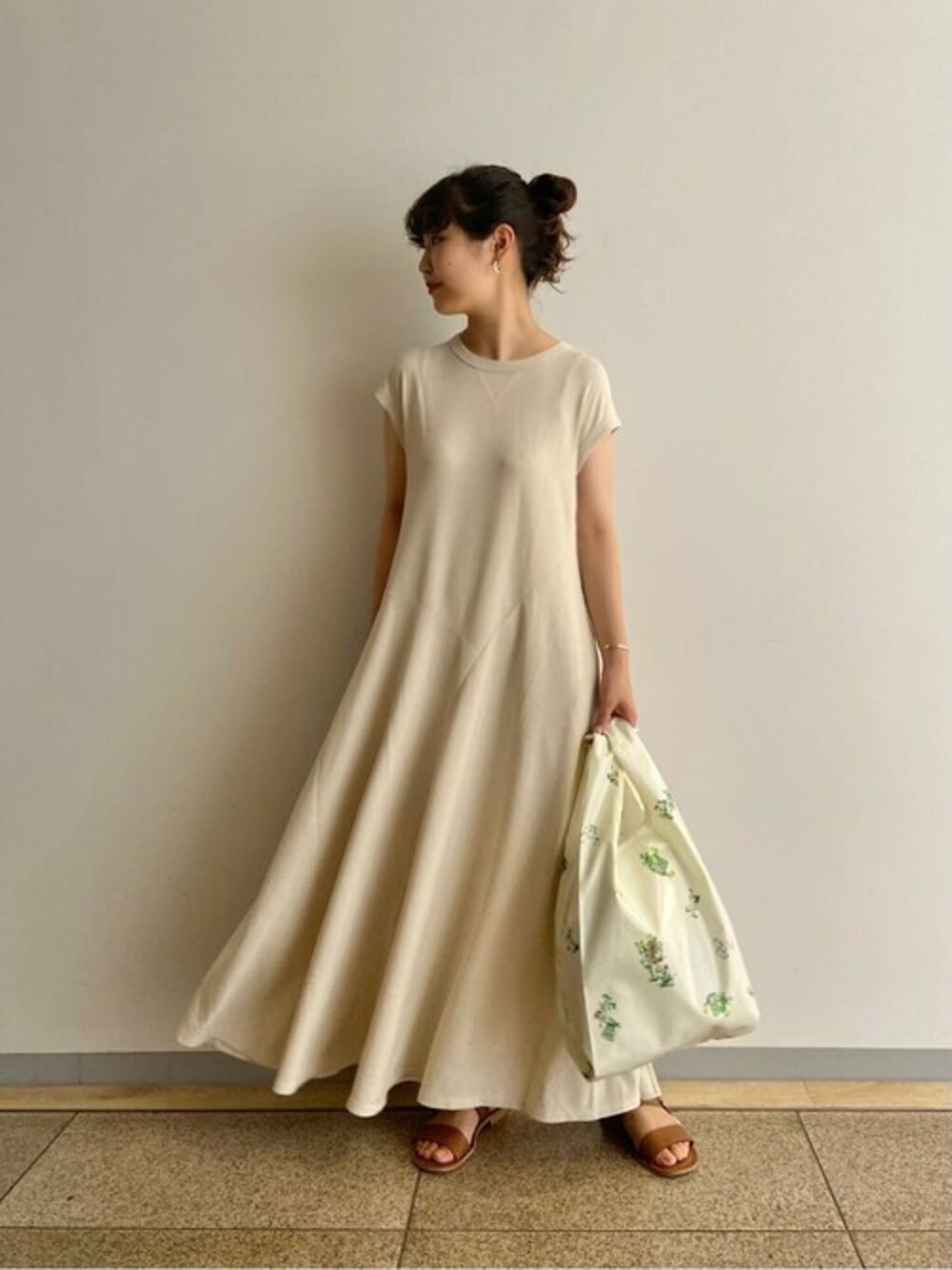 【onepiece 】着用サイズ:F カットソー素材を使った柔らかな着心地です。 腰回りに斜めに切替えを入れ、スカート部分はふんわりと裾がフレアに広がります。 動いた時の揺れ感が素敵なデザインです。 着丈は足首が隠れるフルレングスで、フラットサンダルと合わせても引きずらないです。 洗濯 :手洗い可 伸縮性:あり 透け感:多少あり 裏地 :なし 光沢感:なし 色落ち:なし 【bag】 BEARDSLEY 【sandal】着用サイズ:37.